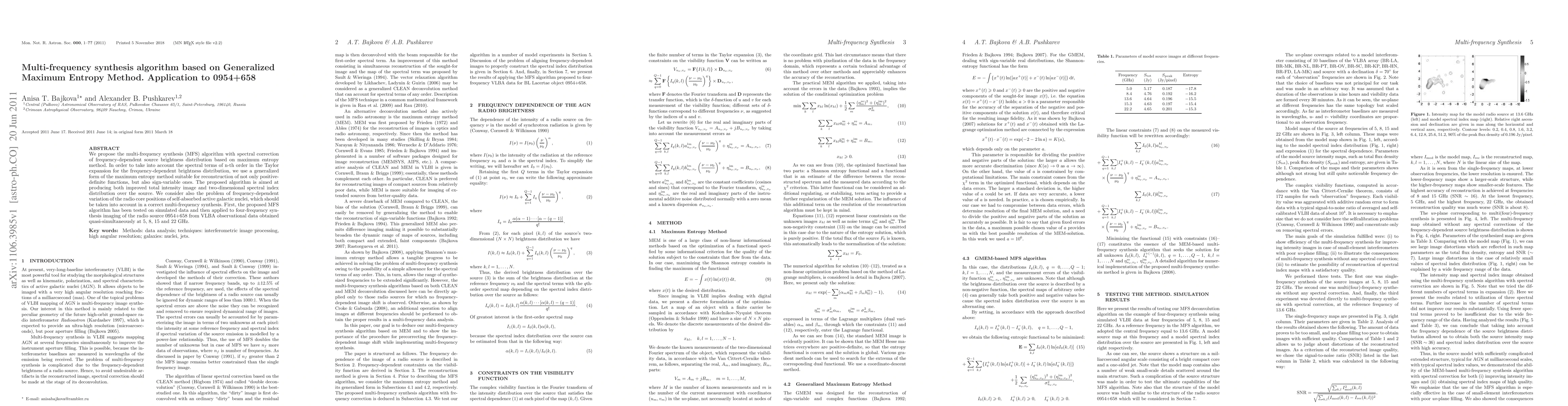 This paper introduces a multi-frequency synthesis algorithm based on the generalized maximum entropy method to correct for frequency-dependent brightness distribution. The algorithm is tested on the radio source 0954+658, producing improved total intensity images and spectral index distributions.
