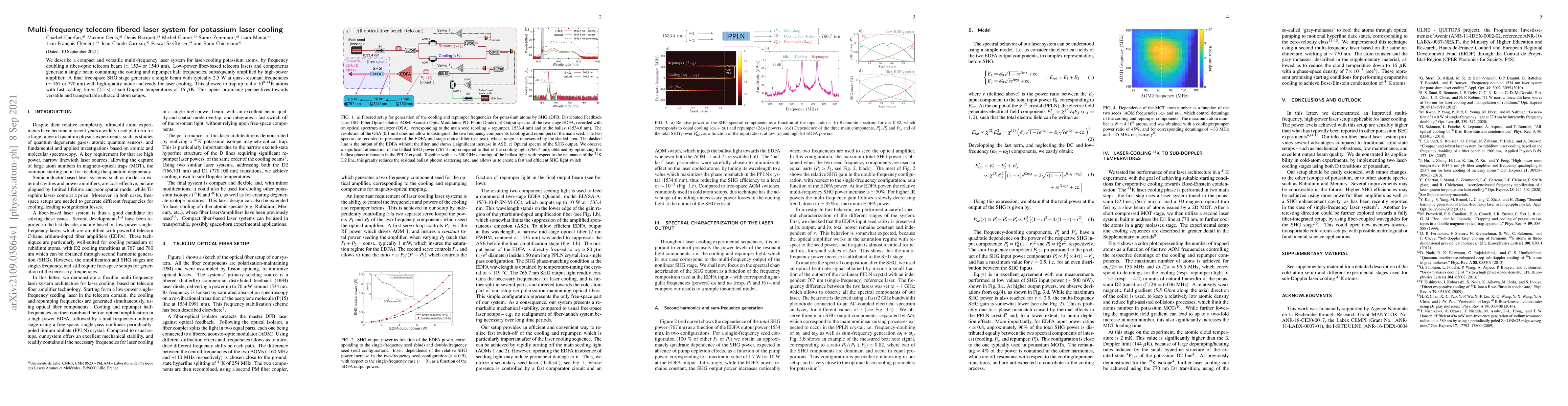 We describe a compact and versatile multi-frequency laser system for laser-cooling potassium atoms, by frequency doubling a fiber-optic telecom beam ($\simeq 1534$ or $1540$~nm). Low-power fiber-based telecom lasers and components generate a single beam containing the cooling and repumper half frequencies, subsequently amplified by high-power amplifier. A final free-space SHG stage generates a single beam with typically 2.5 W at quasi-resonant frequencies ($\simeq 767$ or $770$~nm) with high-quality mode and ready for laser cooling. This allowed to trap up to $4\times10^9$ $^{41}$K atoms with fast loading times (2.5 s) at sub-Doppler temperatures of 16~$\mu$K. This opens promising perspectives towards versatile and transportable ultracold atom setups.