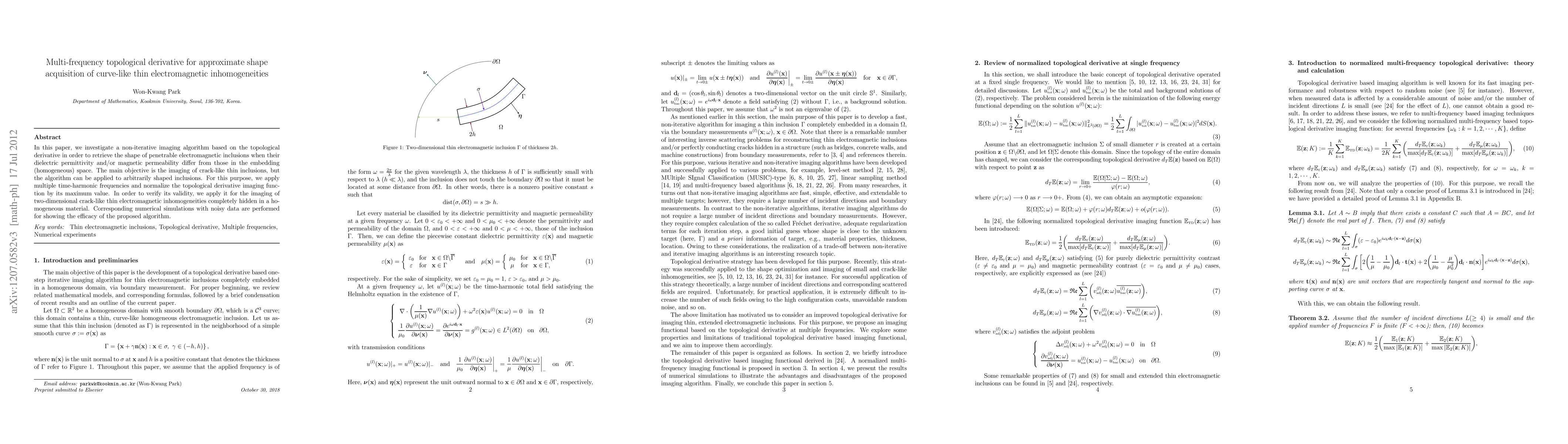 This paper proposes a non-iterative imaging algorithm based on the topological derivative to retrieve the shape of thin electromagnetic inhomogeneities, particularly crack-like inclusions, by using multiple frequencies. Numerical simulations demonstrate the algorithm's effectiveness in imaging hidden inhomogeneities in a homogeneous material.