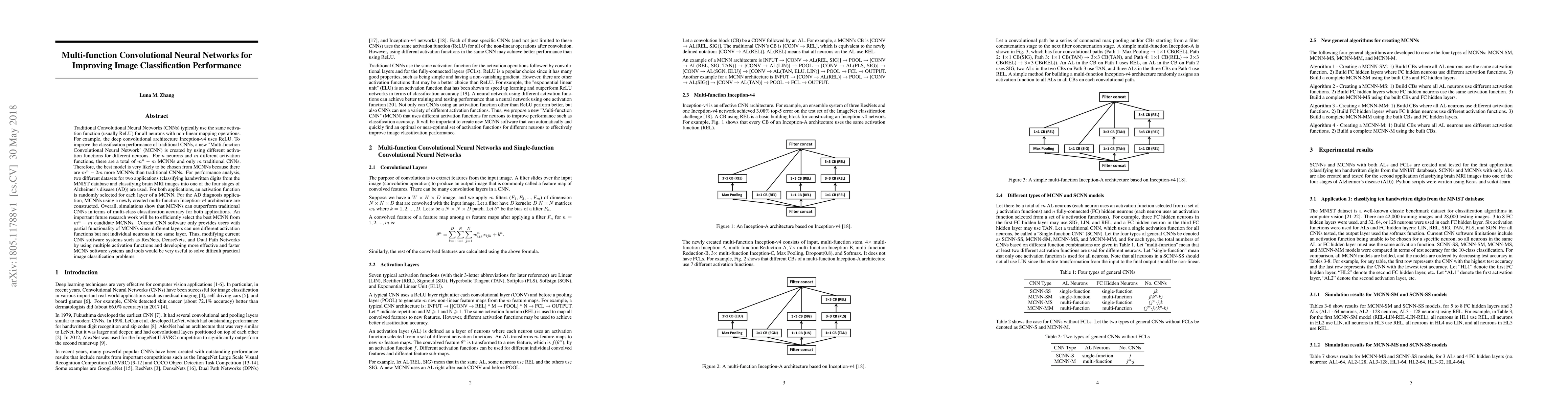 Traditional Convolutional Neural Networks (CNNs) typically use the same activation function (usually ReLU) for all neurons with non-linear mapping operations. For example, the deep convolutional architecture Inception-v4 uses ReLU. To improve the classification performance of traditional CNNs, a new "Multi-function Convolutional Neural Network" (MCNN) is created by using different activation functions for different neurons. For $n$ neurons and $m$ different activation functions, there are a total of $m^n-m$ MCNNs and only $m$ traditional CNNs. Therefore, the best model is very likely to be chosen from MCNNs because there are $m^n-2m$ more MCNNs than traditional CNNs. For performance analysis, two different datasets for two applications (classifying handwritten digits from the MNIST database and classifying brain MRI images into one of the four stages of Alzheimer's disease (AD)) are used. For both applications, an activation function is randomly selected for each layer of a MCNN. For the AD diagnosis application, MCNNs using a newly created multi-function Inception-v4 architecture are constructed. Overall, simulations show that MCNNs can outperform traditional CNNs in terms of multi-class classification accuracy for both applications. An important future research work will be to efficiently select the best MCNN from $m^n-m$ candidate MCNNs. Current CNN software only provides users with partial functionality of MCNNs since different layers can use different activation functions but not individual neurons in the same layer. Thus, modifying current CNN software systems such as ResNets, DenseNets, and Dual Path Networks by using multiple activation functions and developing more effective and faster MCNN software systems and tools would be very useful to solve difficult practical image classification problems.