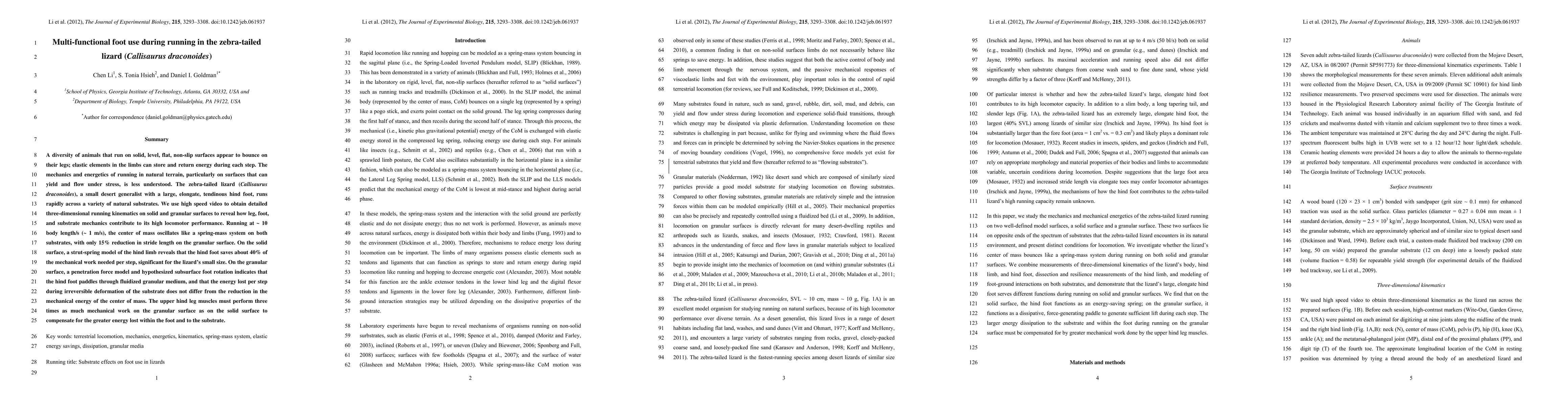 This study investigates the mechanics of running in the zebra-tailed lizard on both solid and granular surfaces using high-speed video. The lizard's hind foot significantly reduces mechanical work on solid surfaces, but on granular surfaces, it paddles through the medium, with the upper hind leg muscles compensating for greater energy loss.
