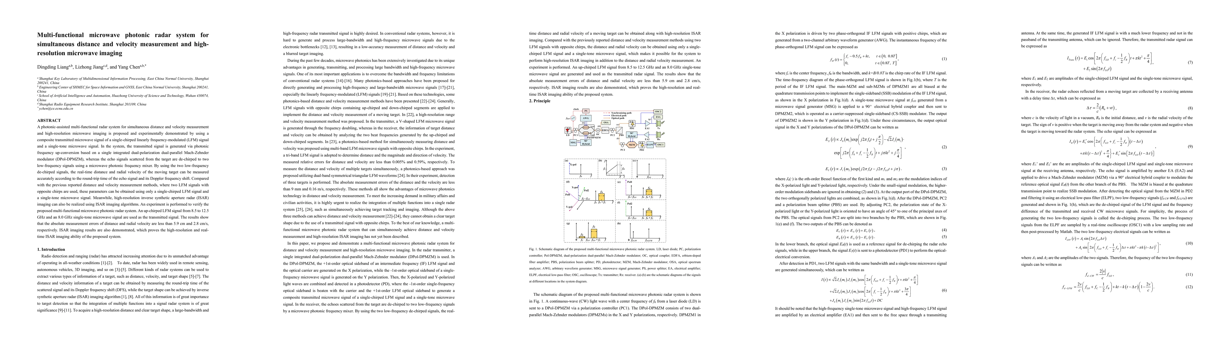 A photonic-assisted multi-functional radar system for simultaneous distance and velocity measurement and high-resolution microwave imaging is proposed and experimentally demonstrated by using a composite transmitted microwave signal of a single-chirped linearly frequency-modulated (LFM) signal and a single-tone microwave signal. In the system, the transmitted signal is generated via photonic frequency up-conversion based on a single integrated dual-polarization dual-parallel Mach-Zehnder modulator (DPol-DPMZM), whereas the echo signals scattered from the target are de-chirped to two low-frequency signals using a microwave photonic frequency mixer. By using the two low-frequency de-chirped signals, the real-time distance and radial velocity of the moving target can be measured accurately according to the round-trip time of the echo signal and its Doppler frequency shift. Compared with the previous reported distance and velocity measurement methods, where two LFM signals with opposite chirps are used, these parameters can be obtained using only a single-chirped LFM signal and a single-tone microwave signal. Meanwhile, high-resolution inverse synthetic aperture radar (ISAR) imaging can also be realized using ISAR imaging algorithms. An experiment is performed to verify the proposed multi-functional microwave photonic radar system. An up-chirped LFM signal from 8.5 to 12.5 GHz and an 8.0 GHz single-tone microwave signal are used as the transmitted signal. The results show that the absolute measurement errors of distance and radial velocity are less than 5.9 cm and 2.8 cm/s, respectively. ISAR imaging results are also demonstrated, which proves the high-resolution and real-time ISAR imaging ability of the proposed system.