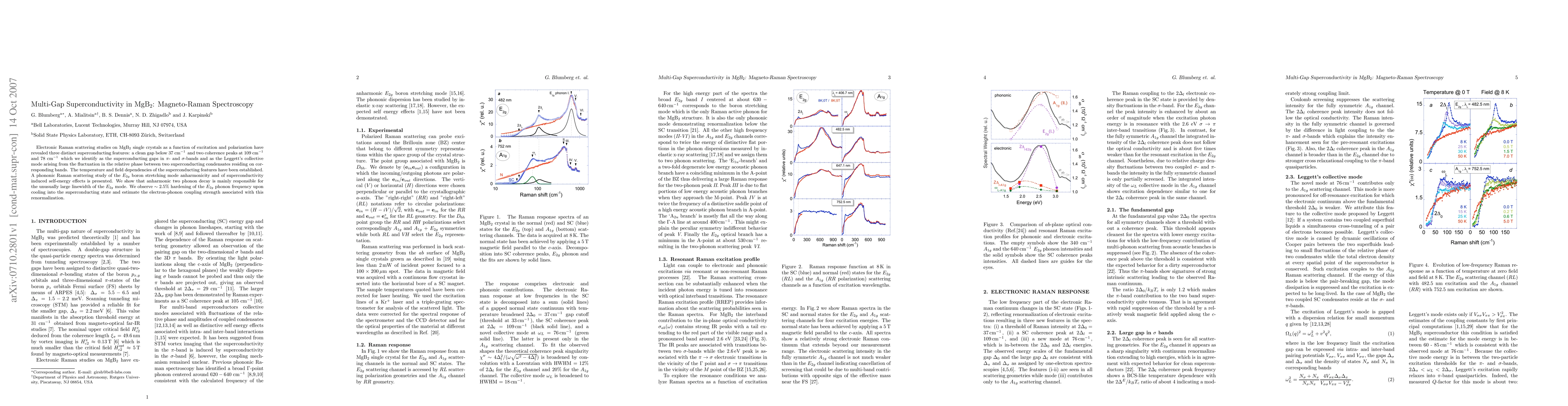 This study uses magneto-Raman spectroscopy to identify three superconducting gaps in MgB2, revealing distinct features in the π- and σ-bands and a collective mode from phase fluctuations. Anharmonic phonon decay explains the large linewidth of the E2g mode, with a ~2.5% increase in phonon frequency upon entering the superconducting state.