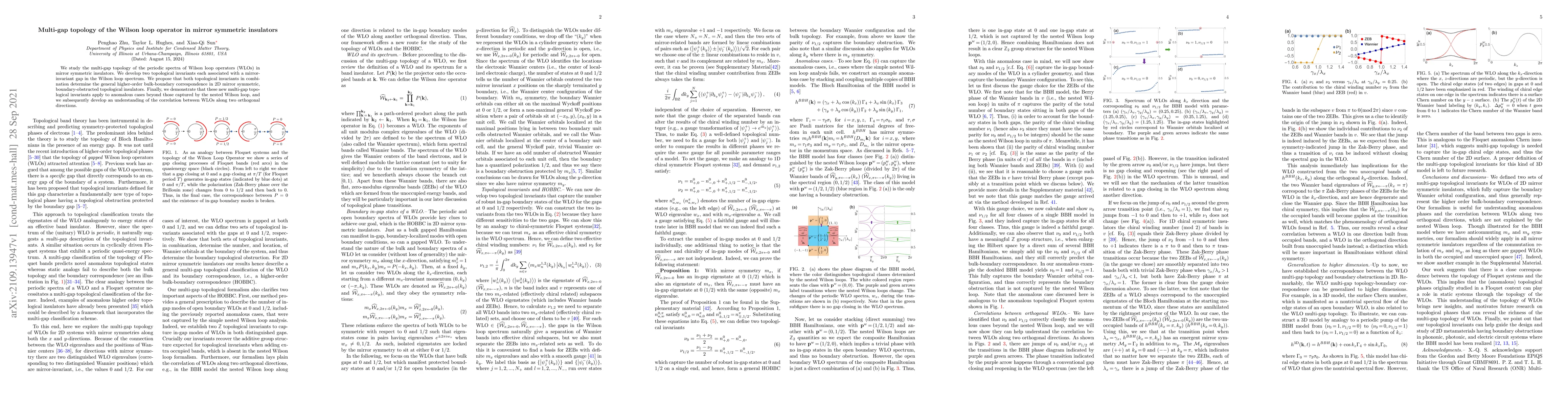 This paper investigates the multi-gap topology of Wilson loop operators in mirror symmetric insulators, proposing two topological invariants linked to mirror-invariant gaps. It suggests these invariants together govern the bulk-boundary correspondence in 2D topological insulators and extend to anomalous cases not covered by nested Wilson loops.