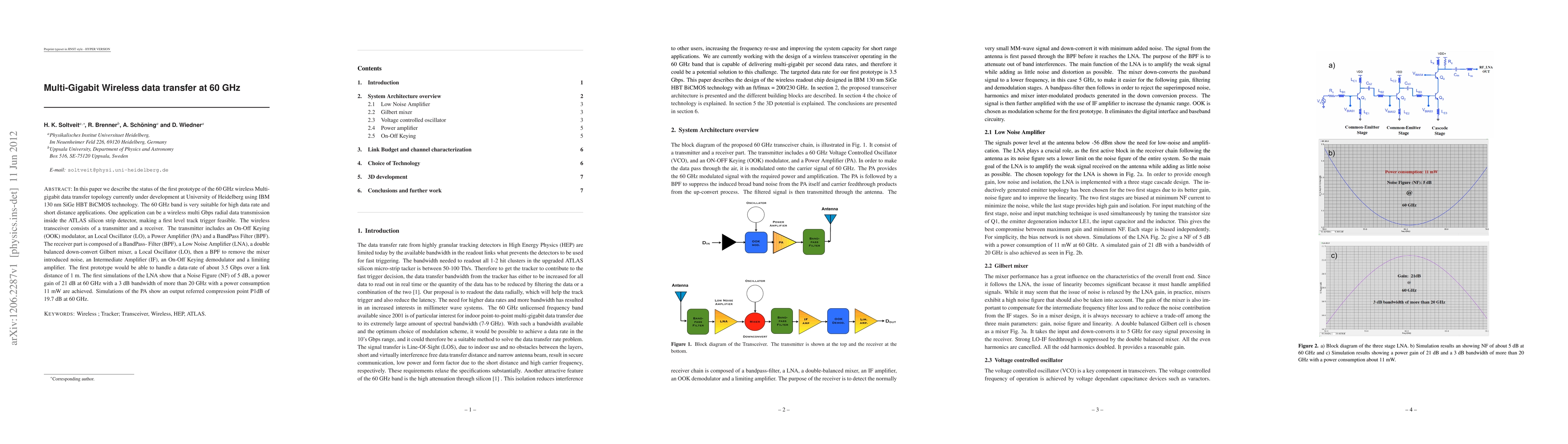 In this paper we describe the status of the first prototype of the 60 GHz wireless Multi-gigabit data transfer topology currently under development at University of Heidelberg using IBM 130 nm SiGe HBT BiCMOS technology. The 60 GHz band is very suitable for high data rate and short distance applications as for example needed in the HEP experments. The wireless transceiver consist of a transmitter and a receiver. The transmitter includes an On-Off Keying (OOK) modulator, an Local Oscillator (LO), a Power Amplifier (PA) and a BandPass Filter (BPF). The receiver part is composed of a BandPass- Filter (BPF), a Low Noise Amplifier (LNA), a double balanced down-convert Gilbert mixer, a Local Oscillator (LO), then a BPF to remove the mixer introduced noise, an Intermediate Amplifier (IF), an On-Off Keying demodulator and a limiting amplifier. The first prototype would be able to handle a data-rate of about 3.5 Gbps over a link distance of 1 m. The first simulations of the LNA show that a Noise Figure (NF) of 5 dB, a power gain of 21 dB at 60 GHz with a 3 dB bandwidth of more than 20 GHz with a power consumption 11 mW are achieved. Simulations of the PA show an output referred compression point P1dB of 19.7 dB at 60 GHz.