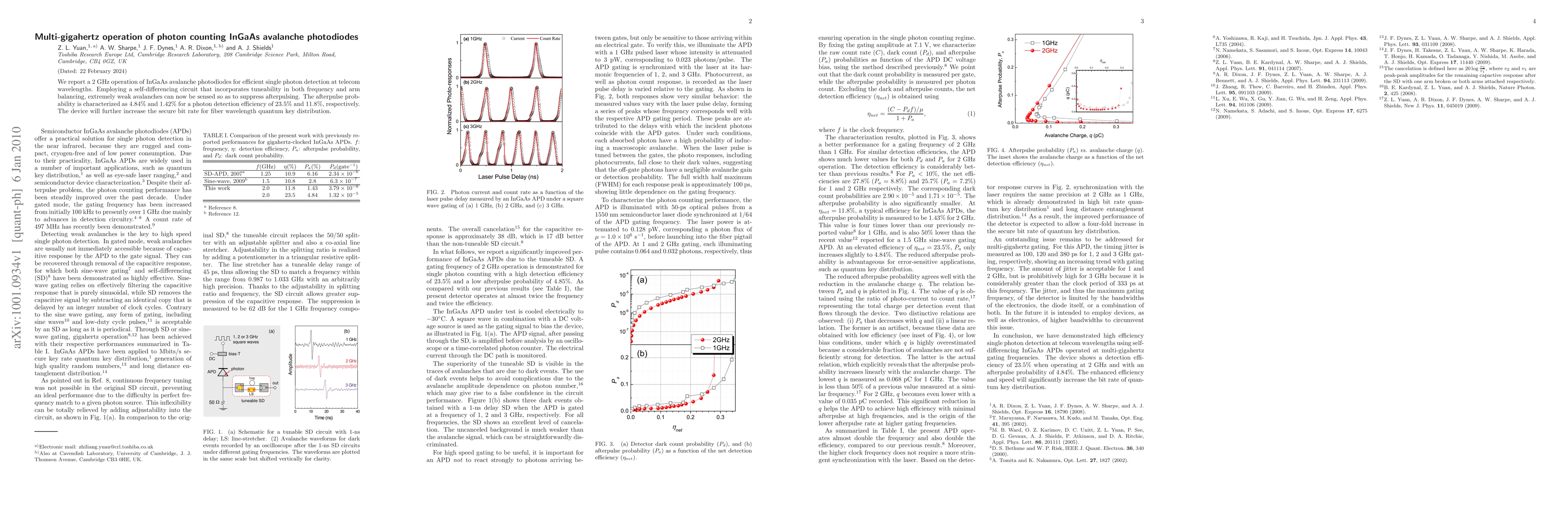 This paper reports the successful operation of InGaAs avalanche photodiodes at 2 GHz for single photon detection, utilizing a self-differencing circuit to suppress afterpulsing with a low afterpulse probability of 4.84% and 1.42%. The device enhances secure bit rate in quantum key distribution applications.