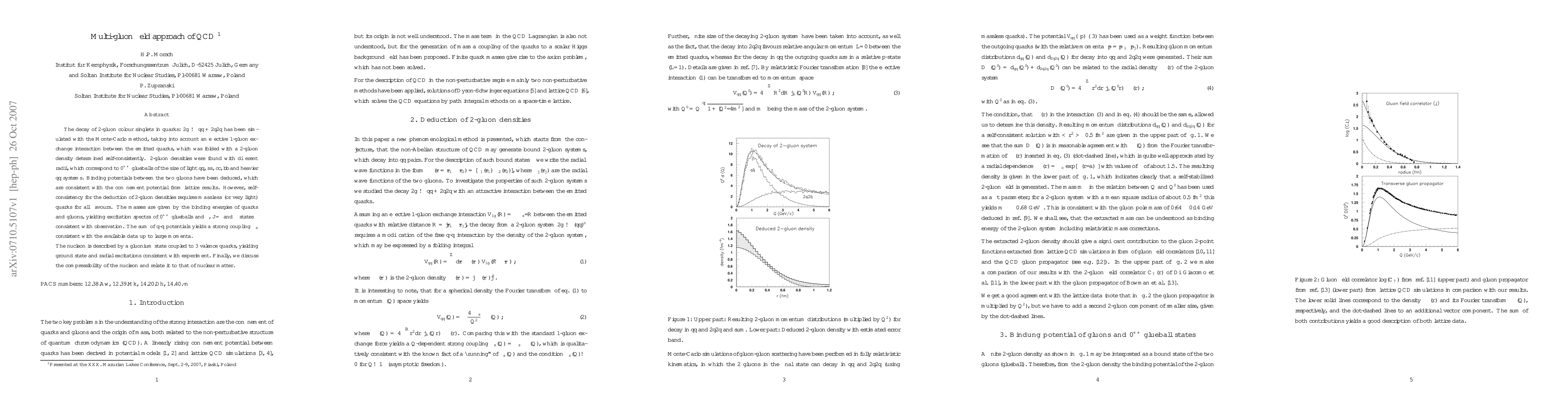 The decay of 2-gluon colour singlets in quarks: 2g --> q-qbar +2q-2qbar has been simulated with the Monte-Carlo method, taking into account an effective 1-gluon exchange interaction between the emitted quarks, which was folded with a 2-gluon density determined self-consistently. 2-gluon densities were found with different radii, which correspond to 0^{++} glueballs of the size of light q-qbar, s-sbar, c-cbar, b-bbar, and heavier q-qbar systems. Binding potentials between the two gluons have been deduced, which are consistent with the confinement potential from lattice results. However, self-consistency for the deduction of 2-gluon densities requires massless (or very light) quarks for all flavours. The masses are given by the binding energies of quarks and gluons, yielding excitation spectra of 0^{++} glueballs and Phi, J/Psi, and Upsilon states consistent with observation. The sum of q-q potentials yields a strong coupling alpha_s consistent with the available data up to large momenta. The nucleon is described by a gluonium state coupled to 3 valence quarks, yielding ground state and radial excitations consistent with experiment. Finally, we discuss the compressibility of the nucleon and relate it to that of nuclear matter.