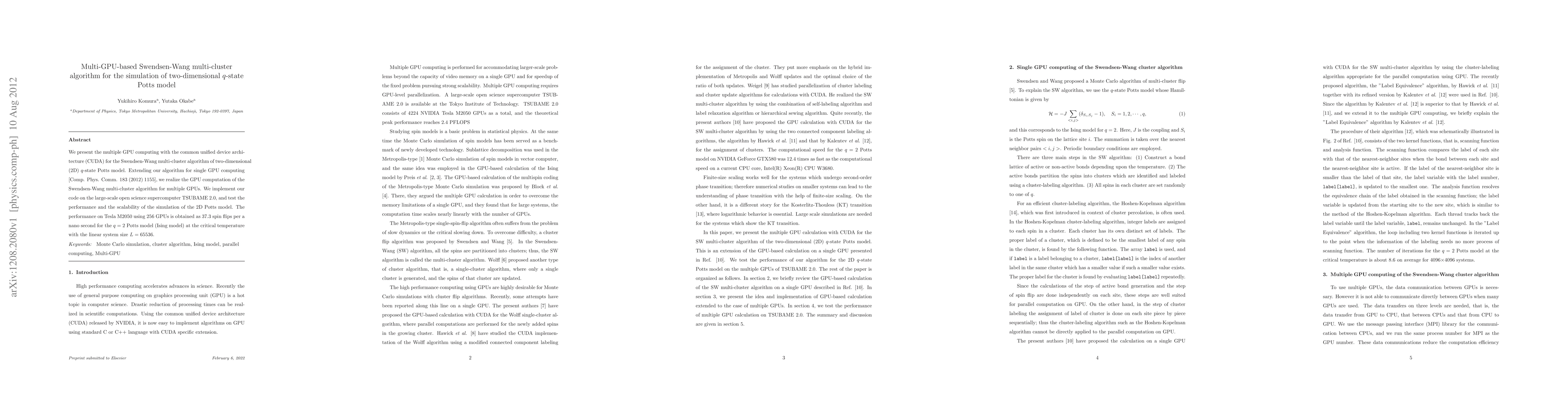 This paper presents a multi-GPU implementation of the Swendsen-Wang multi-cluster algorithm for the 2D q-state Potts model using CUDA, achieving 37.3 spin flips per nanosecond on Tesla M2050 with 256 GPUs, and tests its performance and scalability on the TSUBAME 2.0 supercomputer.