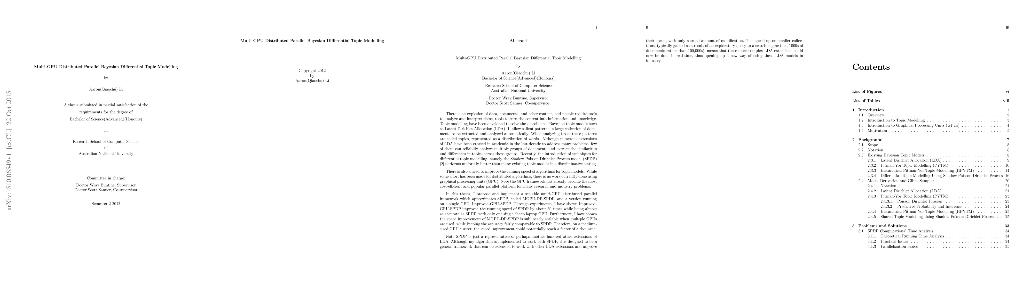 There is an explosion of data, documents, and other content, and people require tools to analyze and interpret these, tools to turn the content into information and knowledge. Topic modeling have been developed to solve these problems. Topic models such as LDA [Blei et. al. 2003] allow salient patterns in data to be extracted automatically. When analyzing texts, these patterns are called topics. Among numerous extensions of LDA, few of them can reliably analyze multiple groups of documents and extract topic similarities. Recently, the introduction of differential topic modeling (SPDP) [Chen et. al. 2012] performs uniformly better than many topic models in a discriminative setting. There is also a need to improve the sampling speed for topic models. While some effort has been made for distributed algorithms, there is no work currently done using graphical processing units (GPU). Note the GPU framework has already become the most cost-efficient platform for many problems. In this thesis, I propose and implement a scalable multi-GPU distributed parallel framework which approximates SPDP. Through experiments, I have shown my algorithms have a gain in speed of about 50 times while being almost as accurate, with only one single cheap laptop GPU. Furthermore, I have shown the speed improvement is sublinearly scalable when multiple GPUs are used, while fairly maintaining the accuracy. Therefore on a medium-sized GPU cluster, the speed improvement could potentially reach a factor of a thousand. Note SPDP is just a representative of other extensions of LDA. Although my algorithm is implemented to work with SPDP, it is designed to be a general enough to work with other topic models. The speed-up on smaller collections (i.e., 1000s of documents), means that these more complex LDA extensions could now be done in real-time, thus opening up a new way of using these LDA models in industry.