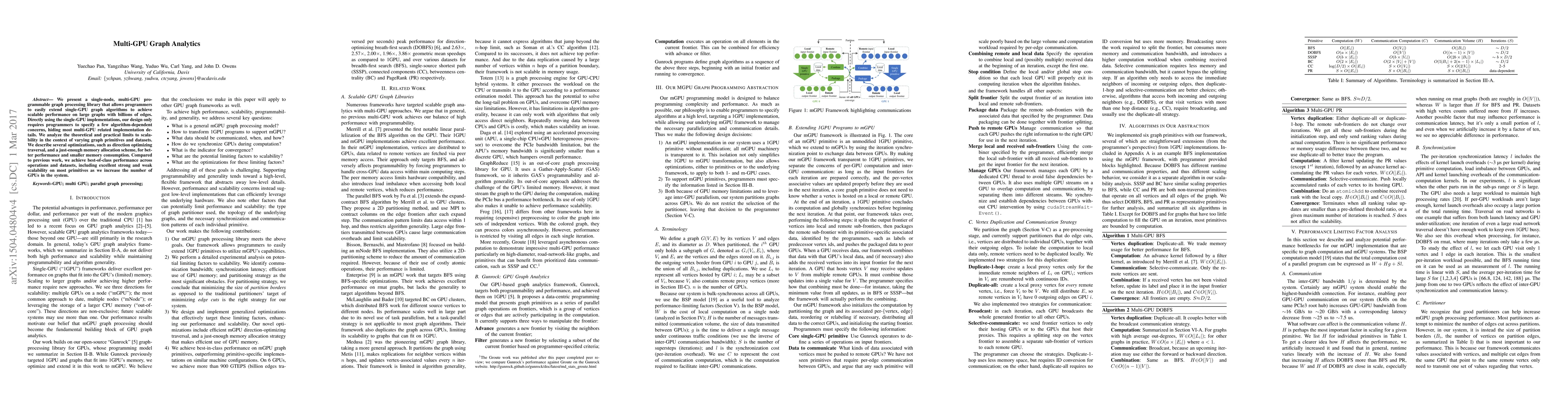 This research introduces a multi-GPU graph processing library that simplifies scaling single-GPU algorithms to large graphs, achieving best-of-class performance and scalability. It includes optimizations like direction-specific traversal and efficient memory allocation, demonstrating strong and weak scalability across various graph operations and datasets.