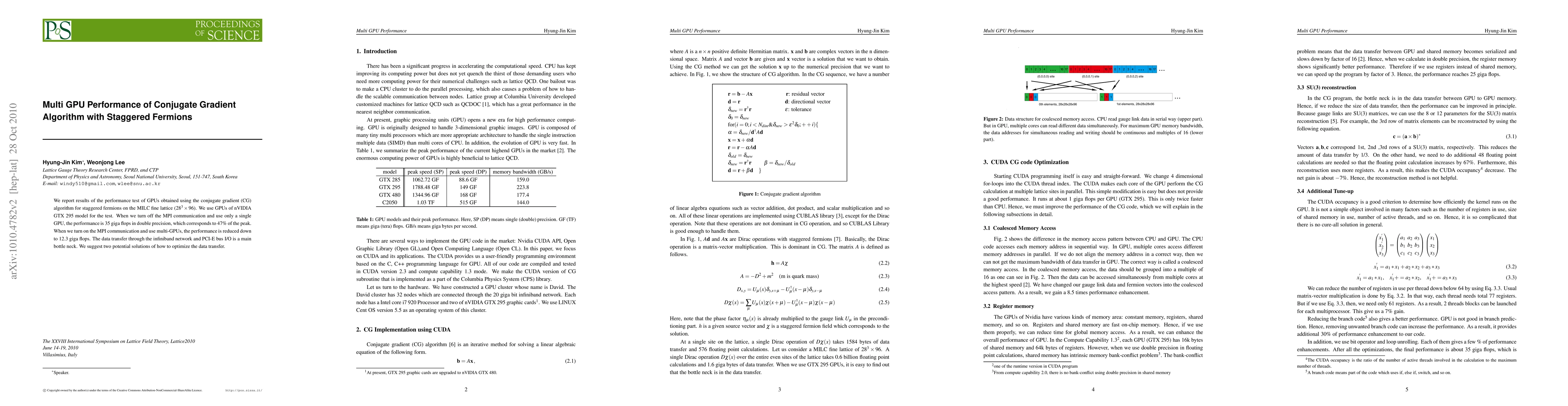 This study evaluates the performance of the conjugate gradient algorithm for staggered fermions on multiple GPUs, finding that while a single GPU achieves 35 giga flops, multi-GPU performance drops to 12.3 giga flops due to data transfer bottlenecks. The authors propose optimizations for data transfer to enhance multi-GPU performance.