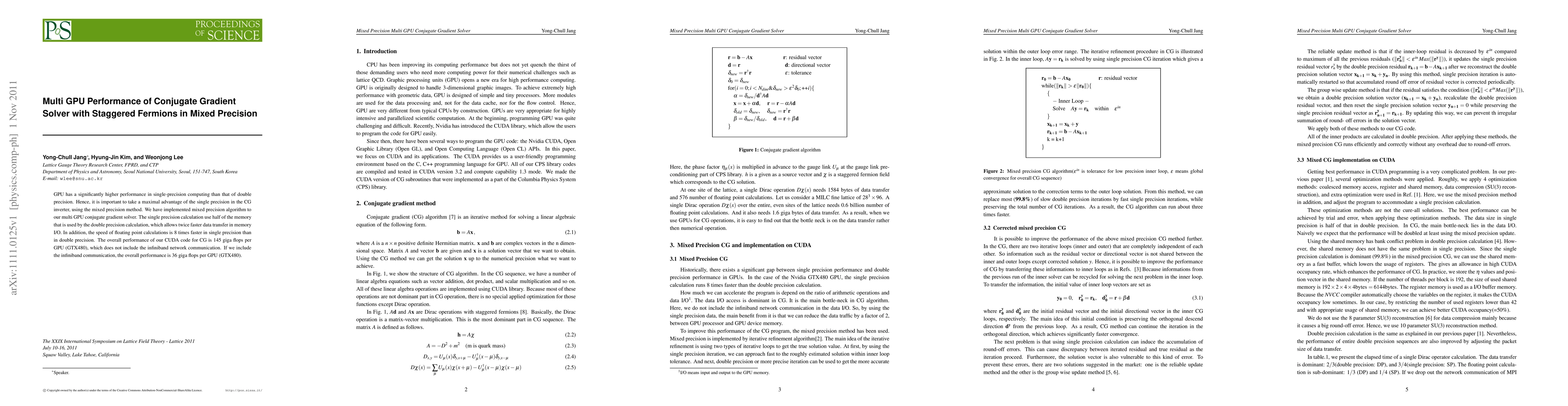 GPU has a significantly higher performance in single-precision computing than that of double precision. Hence, it is important to take a maximal advantage of the single precision in the CG inverter, using the mixed precision method. We have implemented mixed precision algorithm to our multi GPU conjugate gradient solver. The single precision calculation use half of the memory that is used by the double precision calculation, which allows twice faster data transfer in memory I/O. In addition, the speed of floating point calculations is 8 times faster in single precision than in double precision. The overall performance of our CUDA code for CG is 145 giga flops per GPU (GTX480), which does not include the infiniband network communication. If we include the infiniband communication, the overall performance is 36 giga flops per GPU (GTX480).