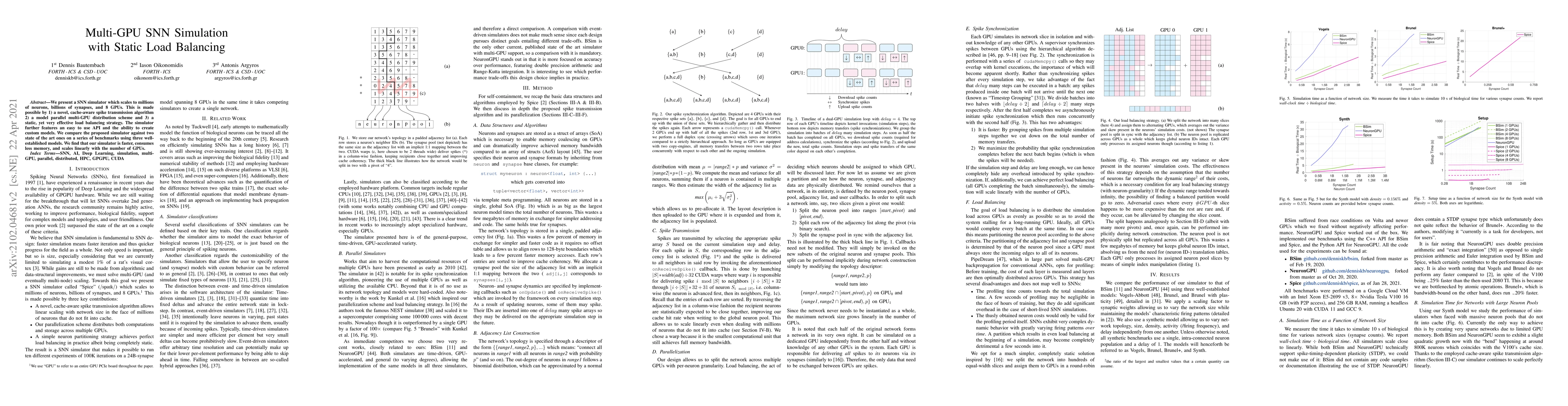 This paper introduces a scalable SNN simulator utilizing up to 8 GPUs, employing a cache-aware spike transmission algorithm, a model parallel distribution scheme, and a static load balancing strategy. The simulator outperforms existing models in speed, memory usage, and linear scalability with GPU count.