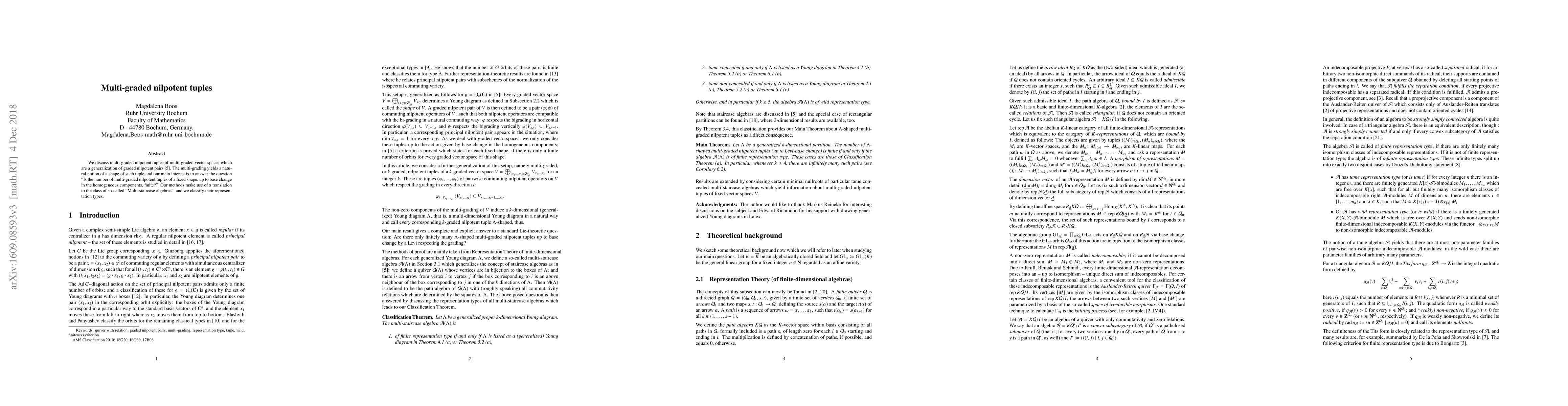 We discuss multi-graded nilpotent tuples of multi-graded vector spaces which are a generalization of graded nilpotent pairs. The multi-grading yields a natural notion of a shape of such tuple and our main interest is to answer the question "Is the number of multi-graded nilpotent tuples of a fixed shape, up to base change in the homogeneous components, finite?" Our methods make use of a translation to the class of so-called "Multi-staircase algebras" and we classify their representation types.