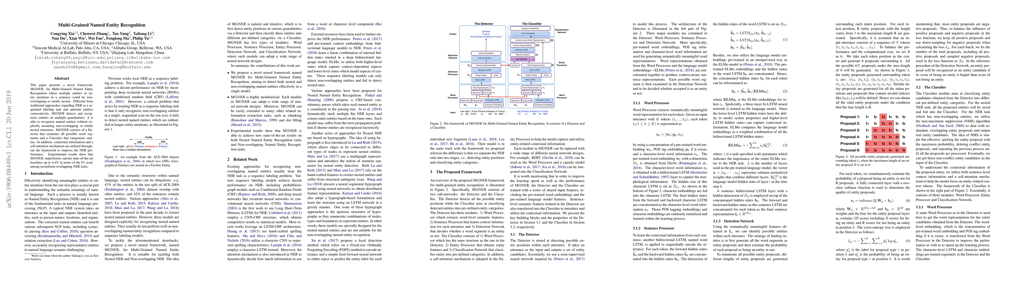 This paper presents a novel framework, MGNER, for Multi-Grained Named Entity Recognition where multiple entities or entity mentions in a sentence could be non-overlapping or totally nested. Different from traditional approaches regarding NER as a sequential labeling task and annotate entities consecutively, MGNER detects and recognizes entities on multiple granularities: it is able to recognize named entities without explicitly assuming non-overlapping or totally nested structures. MGNER consists of a Detector that examines all possible word segments and a Classifier that categorizes entities. In addition, contextual information and a self-attention mechanism are utilized throughout the framework to improve the NER performance. Experimental results show that MGNER outperforms current state-of-the-art baselines up to 4.4% in terms of the F1 score among nested/non-overlapping NER tasks.