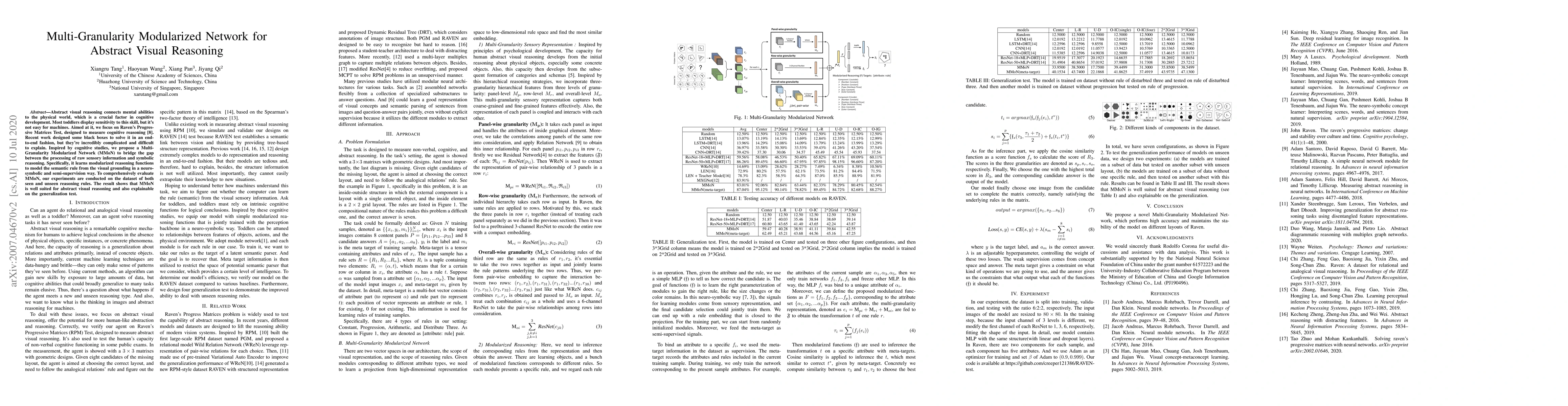 The paper proposes a Multi-Granularity Modularized Network (MMoN) to enhance abstract visual reasoning by bridging raw sensory input with symbolic reasoning, leveraging neuro-symbolic and semi-supervised learning techniques. Experiments on the Raven Progressive Matrices Test show that MMoN is effective and explainable in generalizing unseen reasoning rules.
