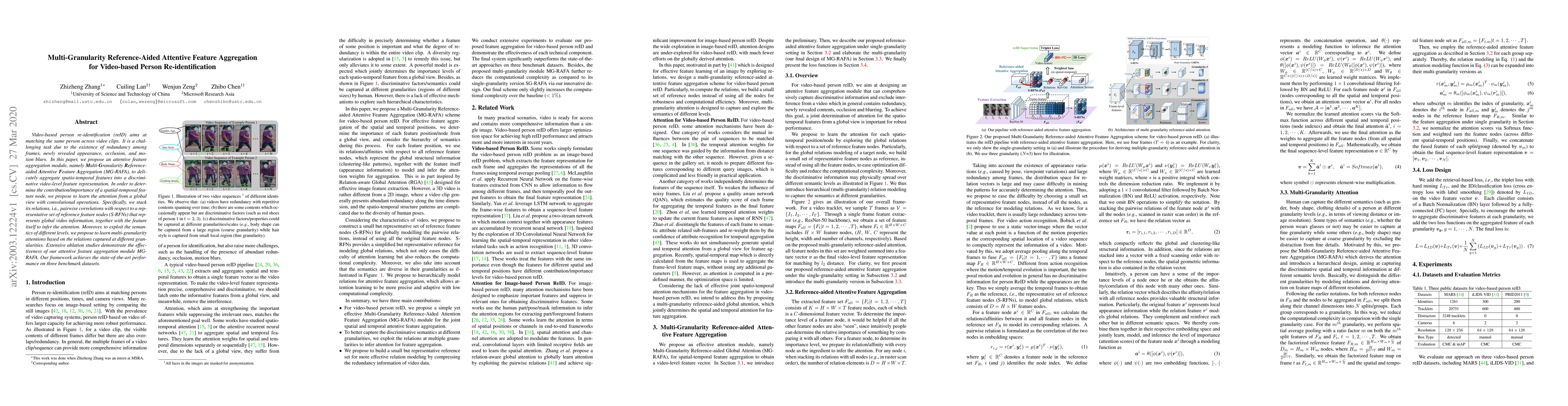 This paper proposes a Multi-Granularity Reference-aided Attentive Feature Aggregation (MG-RAFA) module for video-based person re-identification, which uses attention mechanisms to aggregate spatio-temporal features into a discriminative video-level representation. The method learns attention from global video information and multi-granularity relations to enhance feature discrimination, achieving state-of-the-art performance on benchmark datasets.