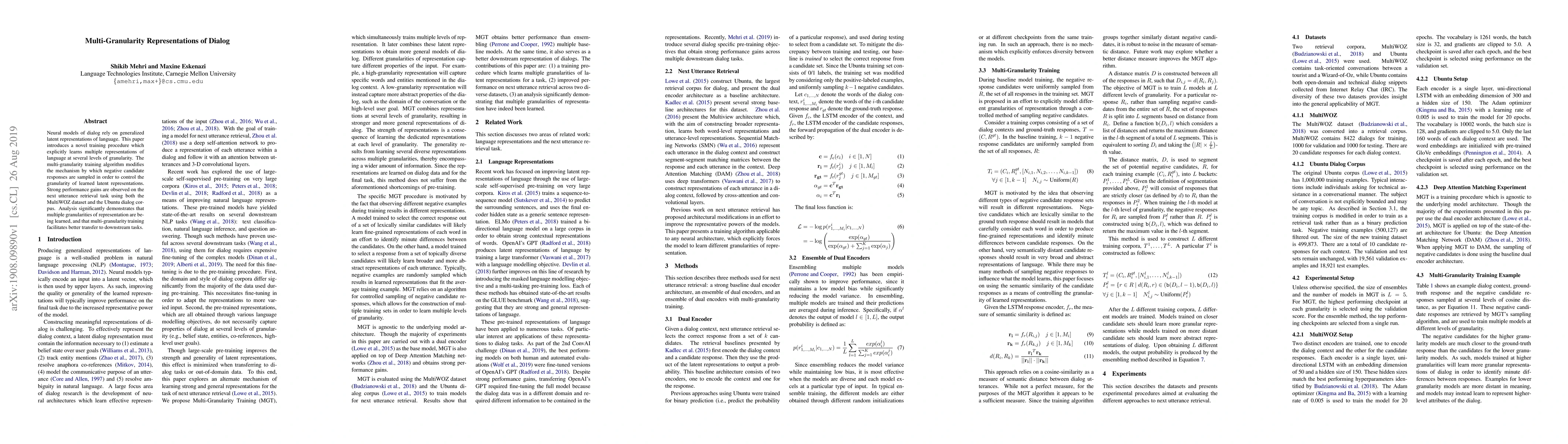 Neural models of dialog rely on generalized latent representations of language. This paper introduces a novel training procedure which explicitly learns multiple representations of language at several levels of granularity. The multi-granularity training algorithm modifies the mechanism by which negative candidate responses are sampled in order to control the granularity of learned latent representations. Strong performance gains are observed on the next utterance retrieval task using both the MultiWOZ dataset and the Ubuntu dialog corpus. Analysis significantly demonstrates that multiple granularities of representation are being learned, and that multi-granularity training facilitates better transfer to downstream tasks.