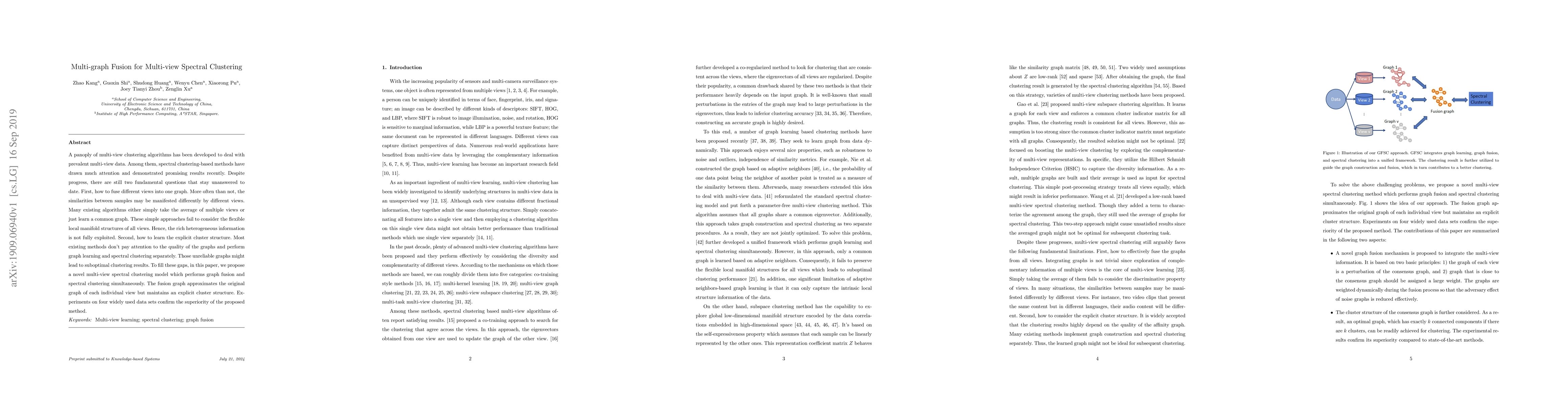 This paper proposes a novel multi-view spectral clustering model that simultaneously performs graph fusion and spectral clustering to better exploit heterogeneous information from different views and ensure reliable graph learning for optimal clustering results. Experiments demonstrate the method's effectiveness on four datasets.