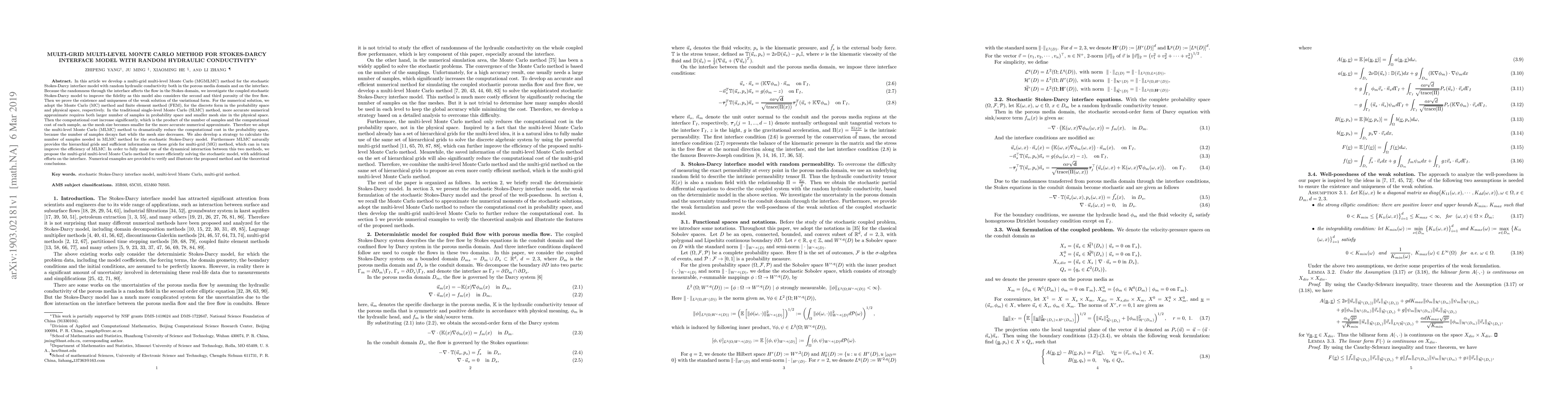 This paper develops a multi-grid multi-level Monte Carlo (MGMLMC) method for solving the stochastic Stokes-Darcy interface model with random hydraulic conductivity. The proposed method combines MLMC to reduce computational cost and a multi-grid approach to improve efficiency, demonstrating improved accuracy and efficiency through numerical examples.
