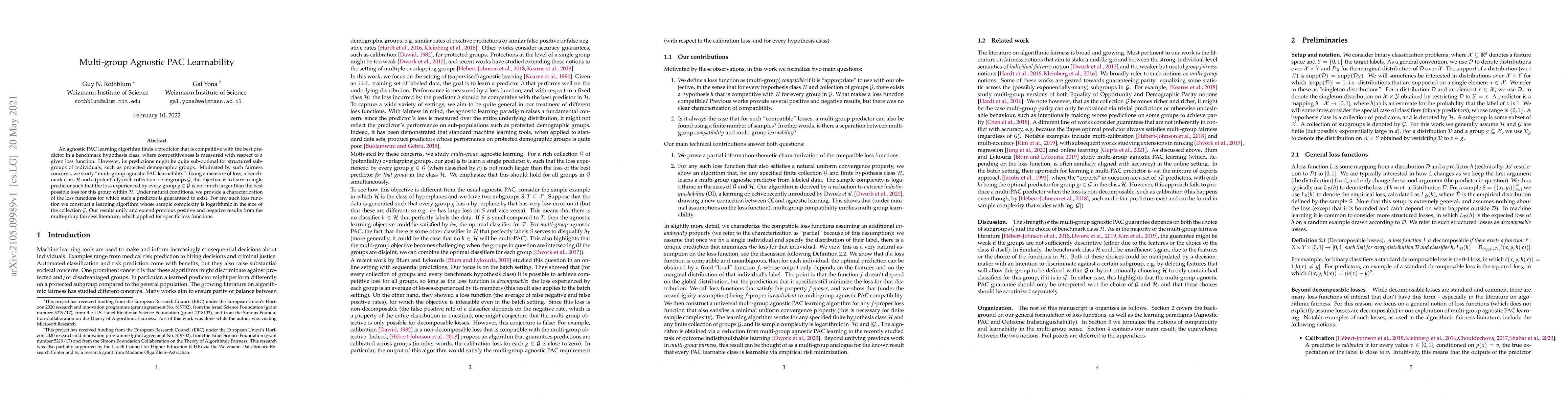 This paper explores multi-group agnostic PAC learnability, focusing on developing a learning algorithm that minimizes loss for multiple demographic subgroups while maintaining competitiveness with the best predictor in the benchmark hypothesis class. The authors provide conditions under which such a predictor is feasible and construct an algorithm with logarithmic sample complexity relative to the number of subgroups.