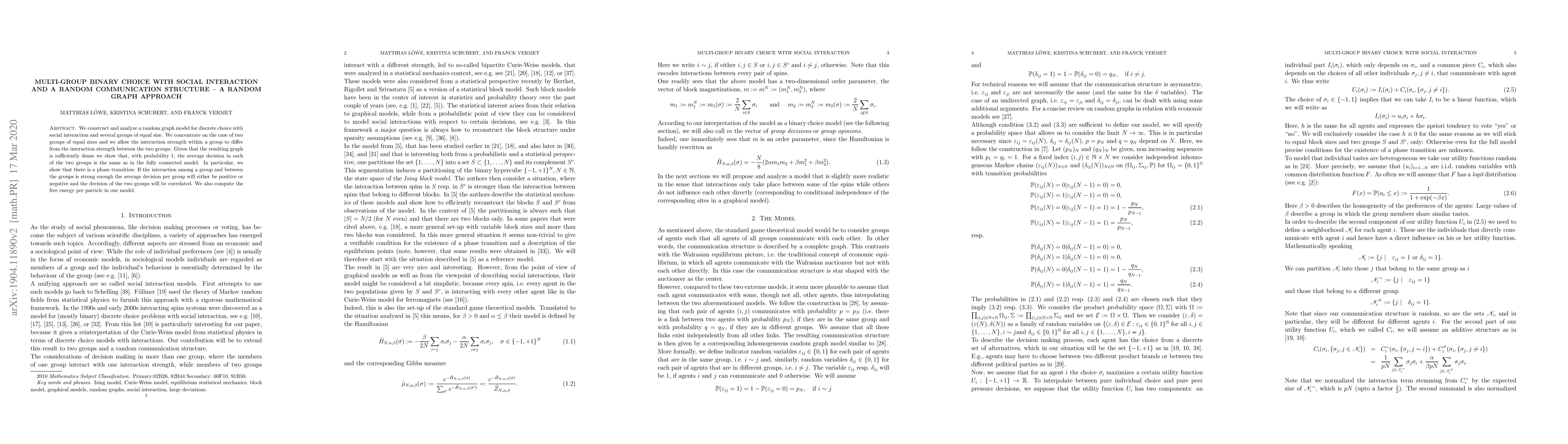 We construct and analyze a random graph model for discrete choice with social interaction and several groups of equal size. We concentrate on the case of two groups of equal sizes and we allow the interaction strength within a group to differ from the interaction strength between the two groups. Given that the resulting graph is sufficiently dense we show that, with probability one, the average decision in each of the two groups is the same as in the fully connected model. In particular, we show that there is a phase transition: If the interaction among a group and between the groups is strong enough the average decision per group will either be positive or negative and the decision of the two groups will be correlated. We also compute the free energy per particle in our model.