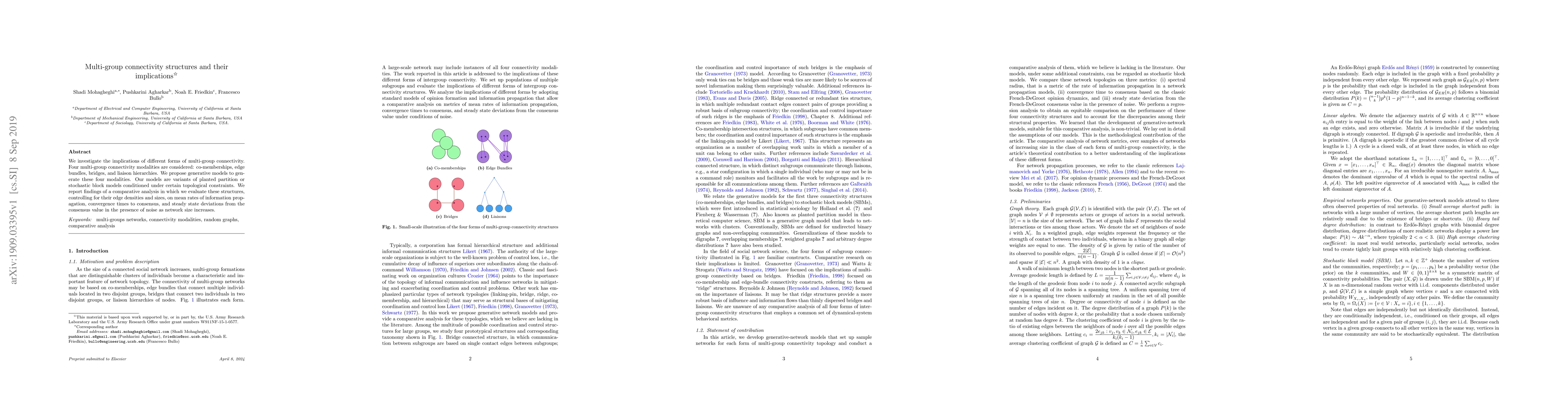 We investigate the implications of different forms of multi-group connectivity. Four multi-group connectivity modalities are considered: co-memberships, edge bundles, bridges, and liaison hierarchies. We propose generative models to generate these four modalities. Our models are variants of planted partition or stochastic block models conditioned under certain topological constraints. We report findings of a comparative analysis in which we evaluate these structures, controlling for their edge densities and sizes, on mean rates of information propagation, convergence times to consensus, and steady state deviations from the consensus value in the presence of noise as network size increases.