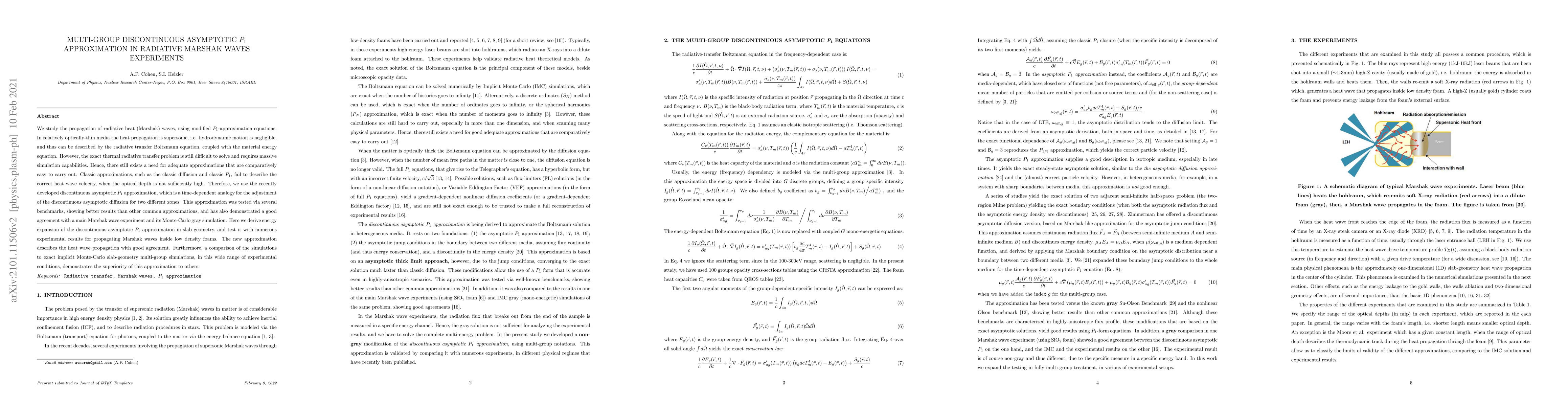 We study the propagation of radiative heat (Marshak) waves, using modified $P_1$-approximation equations. In relatively optically-thin media the heat propagation is supersonic,~i.e. hydrodynamic motion is negligible, and thus can be described by the radiative transfer Boltzmann equation, coupled with the material energy equation. However, the exact thermal radiative transfer problem is still difficult to solve and requires massive simulation capabilities. Hence, there still exists a need for adequate approximations that are comparatively easy to carry out. Classic approximations, such as the classic diffusion and classic $P_1$, fail to describe the correct heat wave velocity, when the optical depth is not sufficiently high. Therefore, we use the recently developed discontinuous asymptotic $P_1$ approximation, which is a time-dependent analogy for the adjustment of the discontinuous asymptotic diffusion for two different zones. This approximation was tested via several benchmarks, showing better results than other common approximations, and has also demonstrated a good agreement with a main Marshak wave experiment and its Monte-Carlo gray simulation. Here we derive energy expansion of the discontinuous asymptotic $P_1$ approximation in slab geometry, and test it with numerous experimental results for propagating Marshak waves inside low density foams. The new approximation describes the heat wave propagation with good agreement. Furthermore, a comparison of the simulations to exact implicit Monte-Carlo slab-geometry multi-group simulations, in this wide range of experimental conditions, demonstrates the superiority of this approximation to others.
