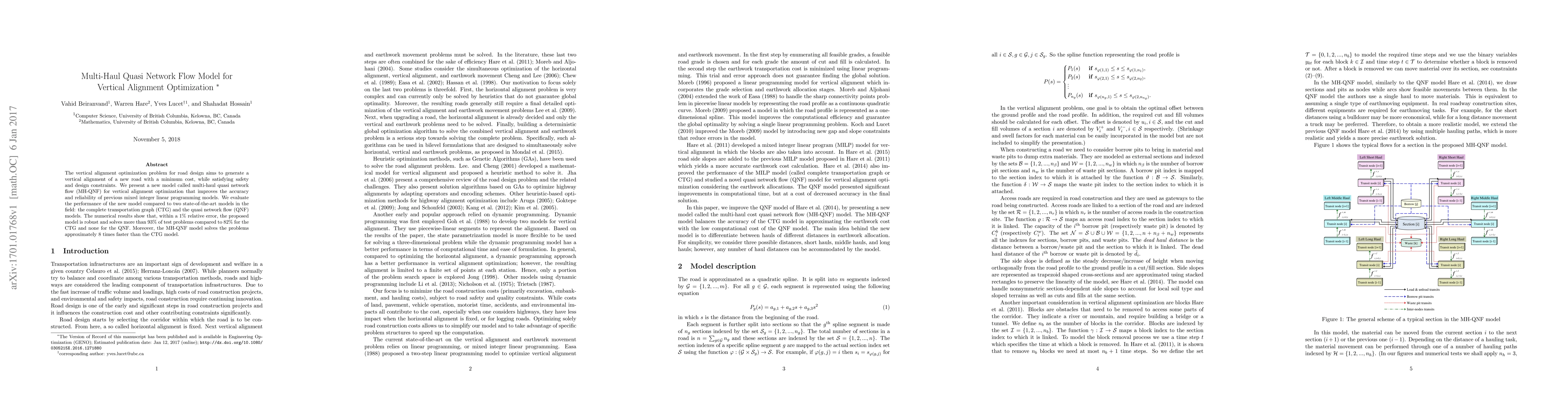 The vertical alignment optimization problem for road design aims to generate a vertical alignment of a new road with a minimum cost, while satisfying safety and design constraints. We present a new model called multi-haul quasi network flow (MH-QNF) for vertical alignment optimization that improves the accuracy and reliability of previous mixed integer linear programming models. We evaluate the performance of the new model compared to two state-of-the-art models in the field: the complete transportation graph (CTG) and the quasi network flow (QNF) models. The numerical results show that, within a 1% relative error, the proposed model is robust and solves more than 93% of test problems compared to 82% for the CTG and none for the QNF. Moreover, the MH-QNF model solves the problems approximately 8 times faster than the CTG model.