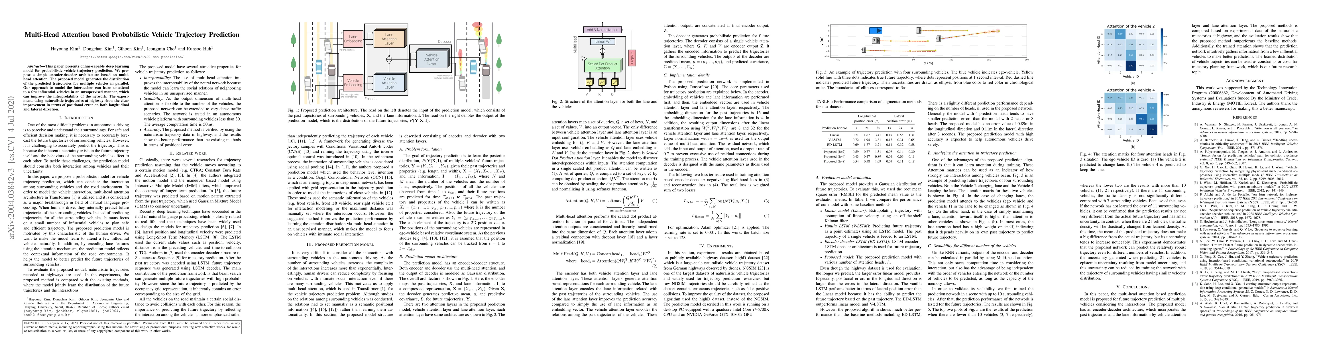 This paper introduces a deep learning model using multi-head attention for online probabilistic vehicle trajectory prediction, showing improved accuracy in predicting multiple vehicle paths. The model's unsupervised learning of influential vehicle interactions enhances interpretability and demonstrates reduced positional error in highway trajectory experiments.