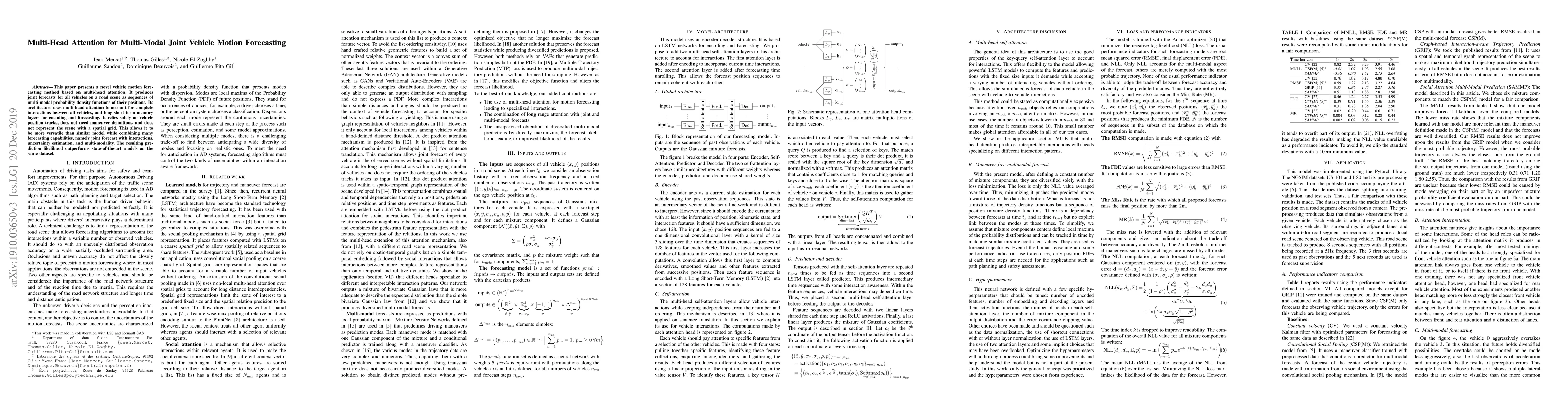 This paper presents a novel vehicle motion forecasting method based on multi-head attention. It produces joint forecasts for all vehicles on a road scene as sequences of multi-modal probability density functions of their positions. Its architecture uses multi-head attention to account for complete interactions between all vehicles, and long short-term memory layers for encoding and forecasting. It relies solely on vehicle position tracks, does not need maneuver definitions, and does not represent the scene with a spatial grid. This allows it to be more versatile than similar model while combining any forecasting capabilities, namely joint forecast with interactions, uncertainty estimation, and multi-modality. The resulting prediction likelihood outperforms state-of-the-art models on the same dataset.