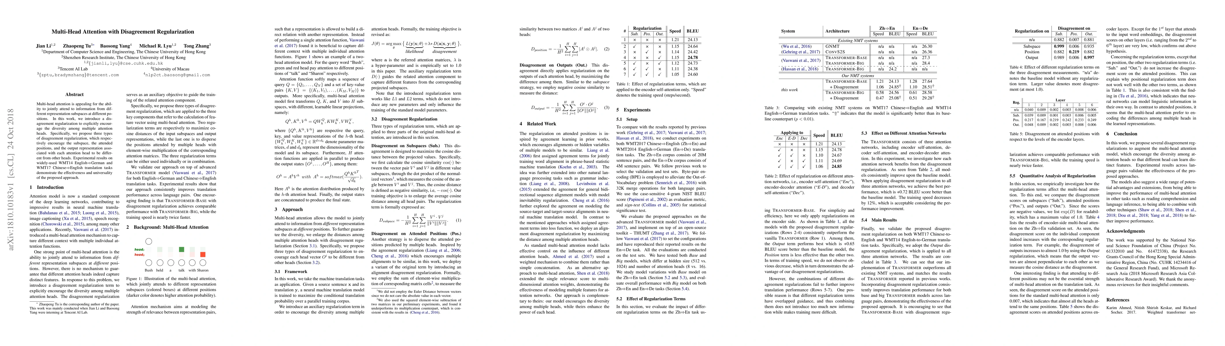 Multi-head attention is appealing for the ability to jointly attend to information from different representation subspaces at different positions. In this work, we introduce a disagreement regularization to explicitly encourage the diversity among multiple attention heads. Specifically, we propose three types of disagreement regularization, which respectively encourage the subspace, the attended positions, and the output representation associated with each attention head to be different from other heads. Experimental results on widely-used WMT14 English-German and WMT17 Chinese-English translation tasks demonstrate the effectiveness and universality of the proposed approach.