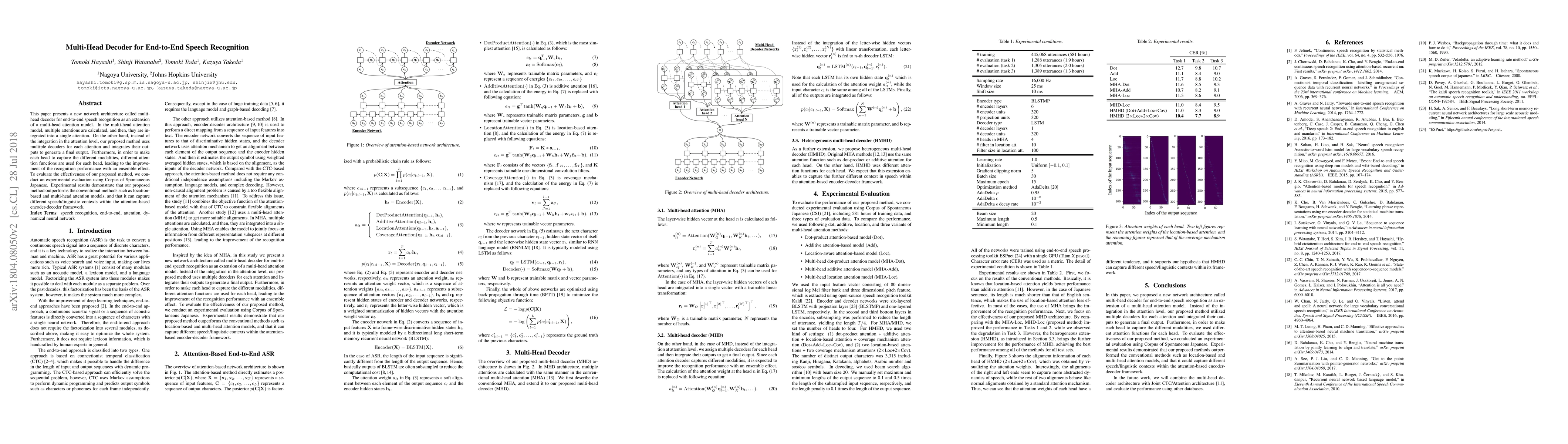 This paper introduces a multi-head decoder architecture for end-to-end speech recognition, utilizing multiple decoders instead of integrating attentions, and different attention functions for each head to capture diverse modalities, resulting in improved recognition performance. Experimental results on the Corpus of Spontaneous Japanese show superior performance compared to conventional methods.