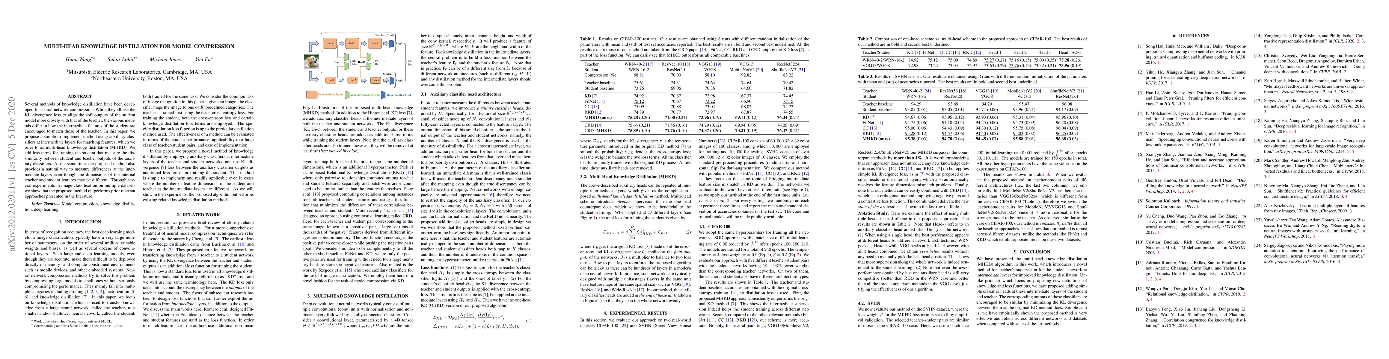 This paper proposes multi-head knowledge distillation (MHKD) for neural network compression, utilizing auxiliary classifiers at intermediate layers to match student and teacher features. The method outperforms existing approaches in image classification tasks across various datasets.