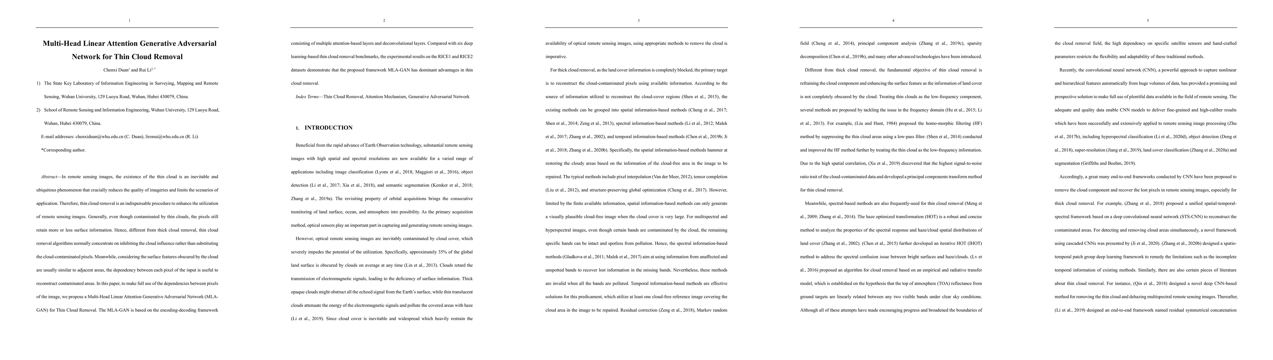 This paper proposes a Multi-Head Linear Attention Generative Adversarial Network (MLAGAN) for enhancing remote sensing images by removing thin clouds, which retain some surface information. The MLAGAN leverages dependencies between pixels through multiple attention-based layers, outperforming existing benchmarks in thin cloud removal experiments on RICE1 and RICE2 datasets.