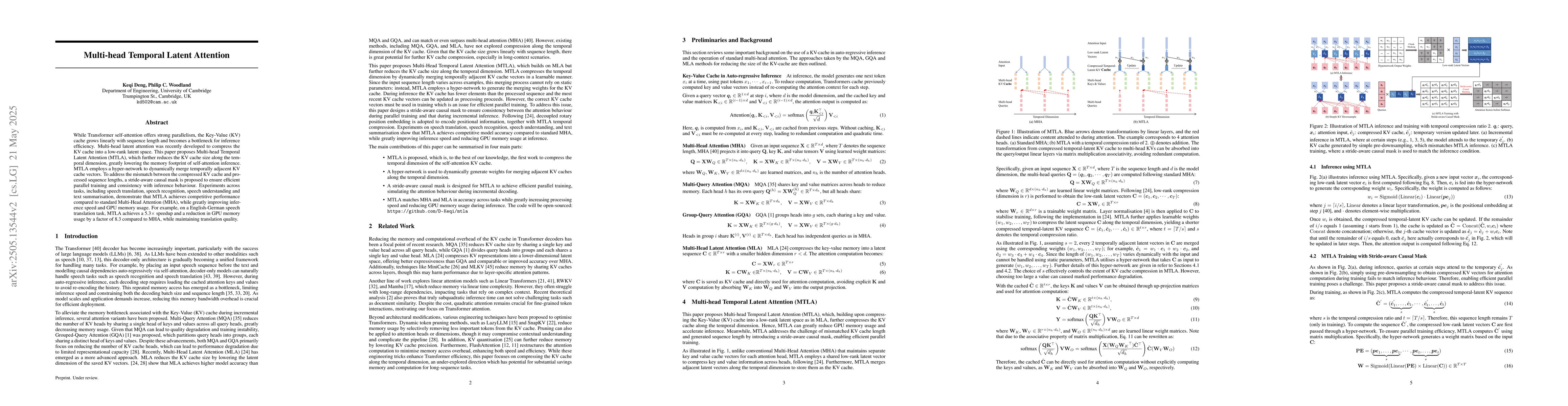 Researchers propose Multi-head Temporal Latent Attention (MTLA) to reduce memory footprint of self-attention inference by compressing the Key-Value cache along the temporal dimension. MTLA achieves competitive performance while improving inference speed and reducing GPU memory usage.