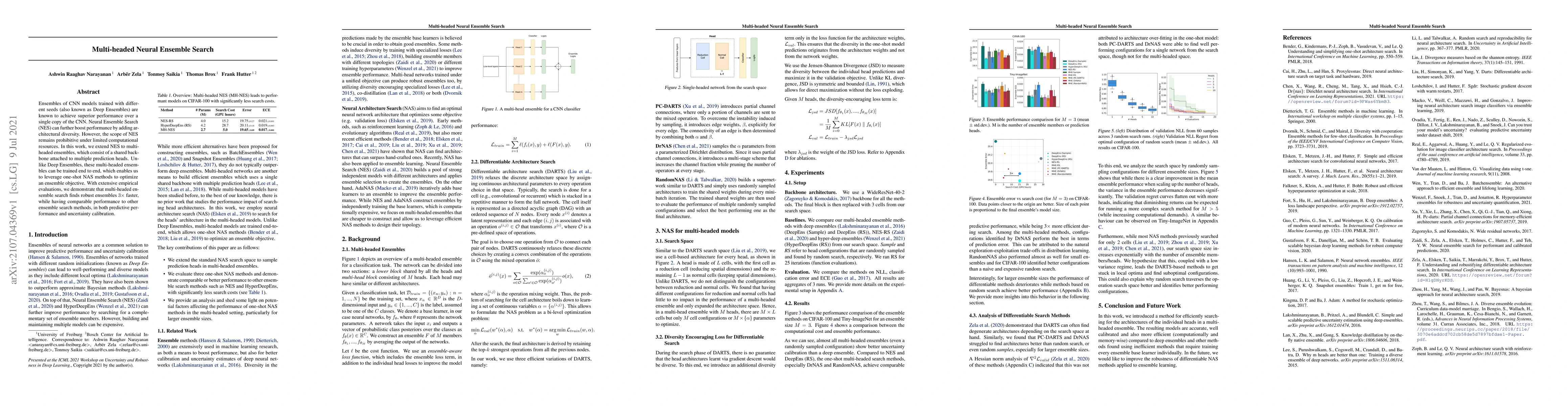 This paper proposes multi-headed neural ensemble search, which uses a shared backbone with multiple prediction heads to optimize ensemble performance. This approach enables faster training and comparable performance to traditional ensemble methods, leveraging one-shot neural architecture search for optimization.