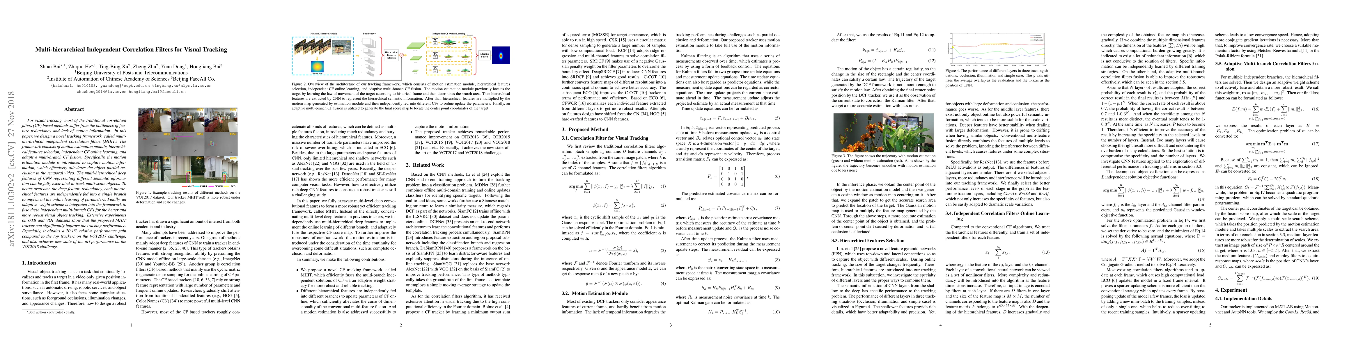 This paper introduces a novel multi-hierarchical independent correlation filters (MHIT) framework for visual tracking, which includes motion estimation, hierarchical feature selection, independent online learning, and adaptive multi-branch fusion. The proposed method significantly improves tracking performance, achieving a 20.1% relative gain over top trackers on the VOT2017 challenge and setting new state-of-the-art on VOT2018.