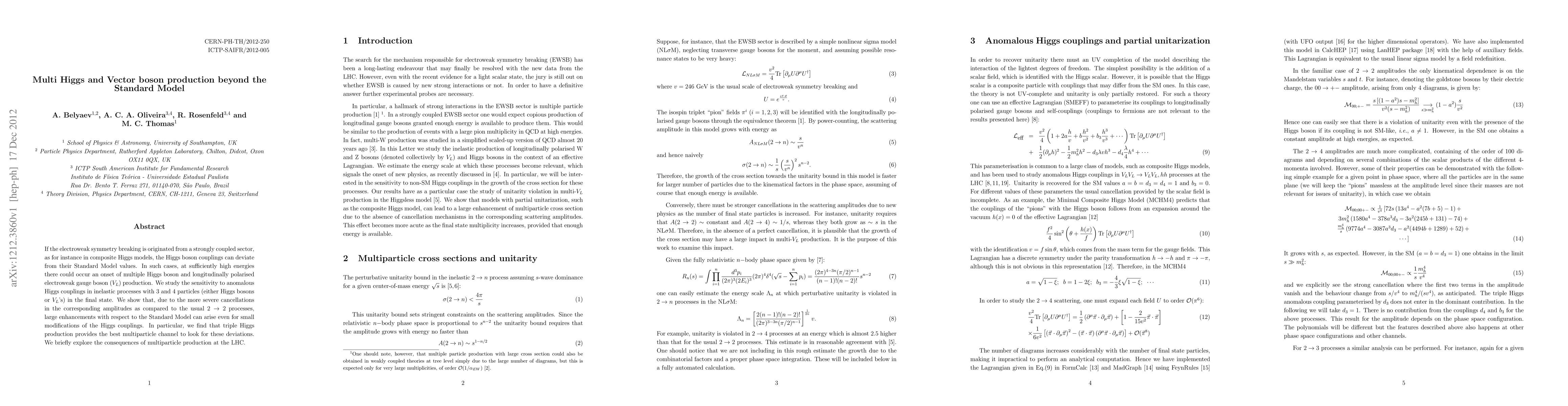 If the electroweak symmetry breaking is originated from a strongly coupled sector, as for instance in composite Higgs models, the Higgs boson couplings can deviate from their Standard Model values. In such cases, at sufficiently high energies there could occur an onset of multiple Higgs boson and longitudinally polarised electroweak gauge boson (V_L) production. We study the sensitivity to anomalous Higgs couplings in inelastic processes with 3 and 4 particles (either Higgs bosons or V_L's) in the final state. We show that, due to the more severe cancellations in the corresponding amplitudes as compared to the usual 2 to 2 processes, large enhancements with respect to the Standard Model can arise even for small modifications of the Higgs couplings. In particular, we find that triple Higgs production provides the best multiparticle channel to look for these deviations. We briefly explore the consequences of multiparticle production at the LHC.