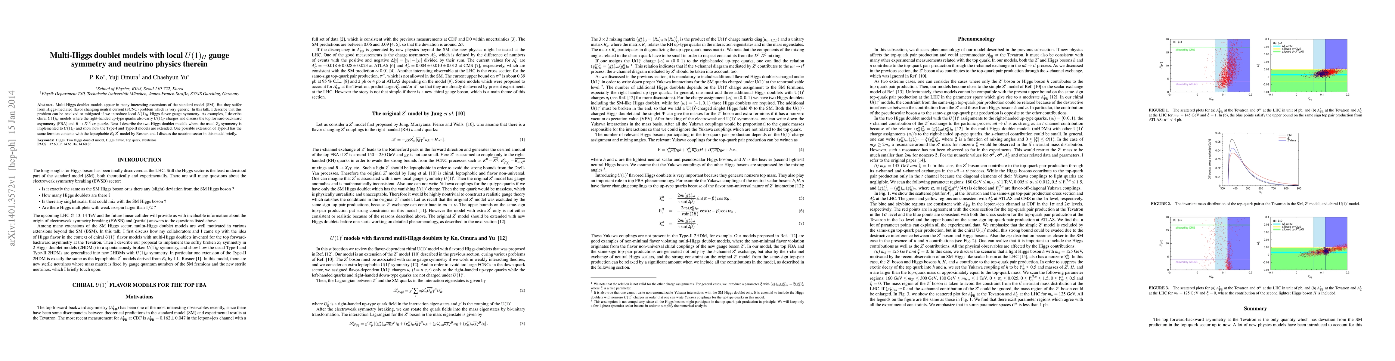 This paper discusses multi-Higgs doublet models with local $U(1)_H$ gauge symmetry to resolve the Higgs-mediated flavor changing neutral current problem. It explores chiral $U(1)_H$ models and their implications for top quark asymmetry and $B$ meson decays, and extends Type-I and Type-II models with $U(1)_H$ symmetry, including a leptophobic $Z^{'}$ model connection and a brief discussion on the neutrino sector.