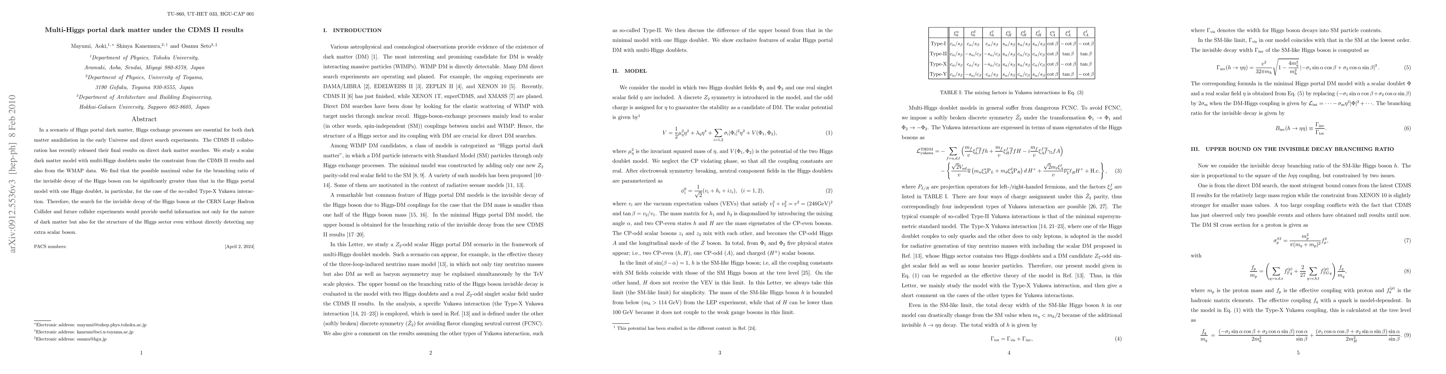 In a scenario of Higgs portal dark matter, Higgs exchange processes are essential for both dark matter annihilation in the early Universe and direct search experiments. The CDMS II collaboration has recently released their final results on direct dark matter searches. We study a scalar dark matter model with multi-Higgs doublets under the constraint from the CDMS II results and also from the WMAP data. We find that the possible maximal value for the branching ratio of the invisible decay of the Higgs boson can be significantly greater than that in the Higgs portal model with one Higgs doublet, in particular, for the case of the so-called Type-X Yukawa interaction. Therefore, the search for the invisible decay of the Higgs boson at the CERN Large Hadron Collider and future collider experiments would provide useful information not only for the nature of dark matter but also for the structure of the Higgs sector even without directly detecting any extra scalar boson.