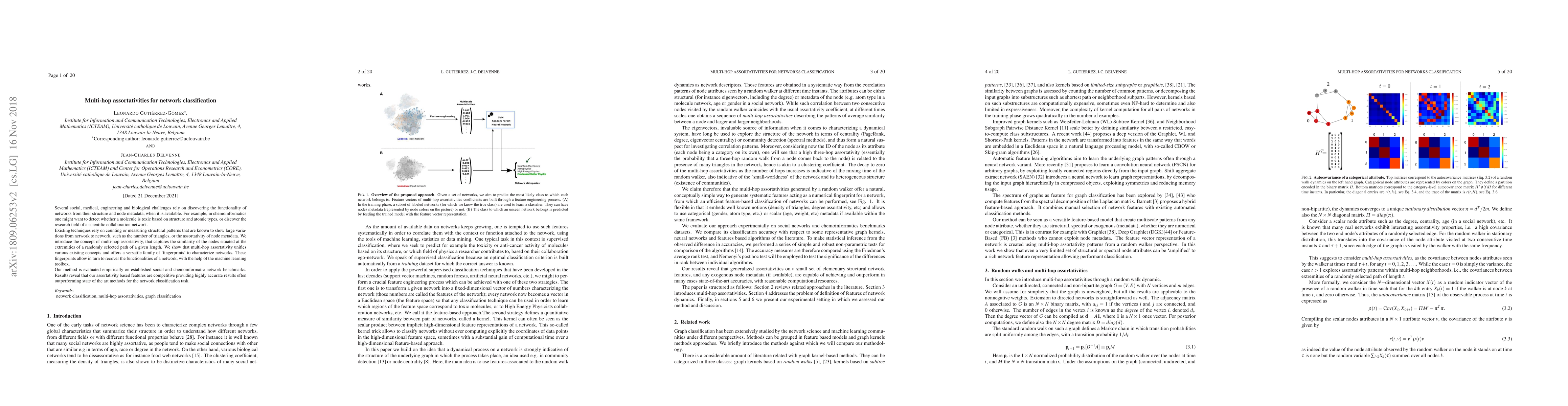 Several social, medical, engineering and biological challenges rely on discovering the functionality of networks from their structure and node metadata, when it is available. For example, in chemoinformatics one might want to detect whether a molecule is toxic based on structure and atomic types, or discover the research field of a scientific collaboration network. Existing techniques rely on counting or measuring structural patterns that are known to show large variations from network to network, such as the number of triangles, or the assortativity of node metadata. We introduce the concept of multi-hop assortativity, that captures the similarity of the nodes situated at the extremities of a randomly selected path of a given length. We show that multi-hop assortativity unifies various existing concepts and offers a versatile family of 'fingerprints' to characterize networks. These fingerprints allow in turn to recover the functionalities of a network, with the help of the machine learning toolbox. Our method is evaluated empirically on established social and chemoinformatic network benchmarks. Results reveal that our assortativity based features are competitive providing highly accurate results often outperforming state of the art methods for the network classification task.