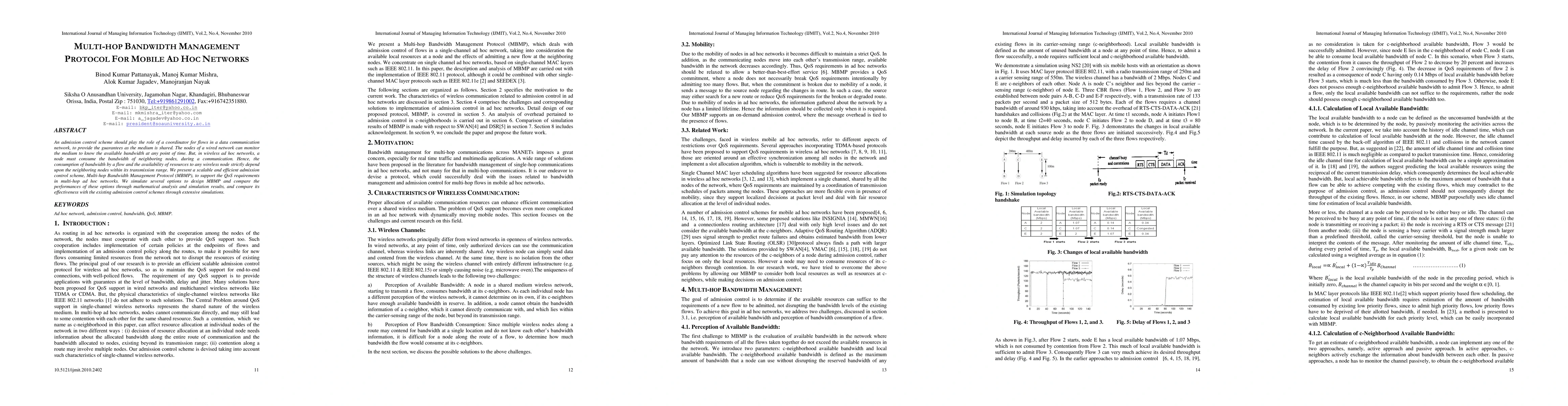 The paper proposes the Multi-Hop Bandwidth Management Protocol (MBMP) for admission control in multi-hop ad hoc networks, addressing the challenge of bandwidth consumption among neighboring nodes. The protocol is evaluated through simulations and mathematical analysis, demonstrating its effectiveness compared to existing admission control schemes.