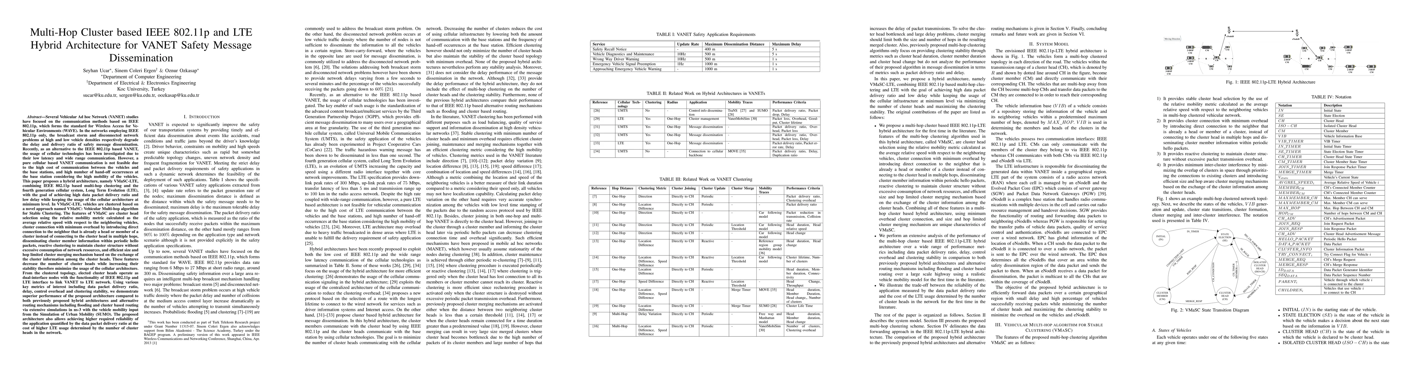 The novelty of this work lies in the integration of IEEE 802.11p and LTE in a hybrid architecture with a novel VMaSC clustering algorithm, designed to maintain stable clusters and efficiently manage cluster head transitions, thereby improving VANET safety message dissemination.