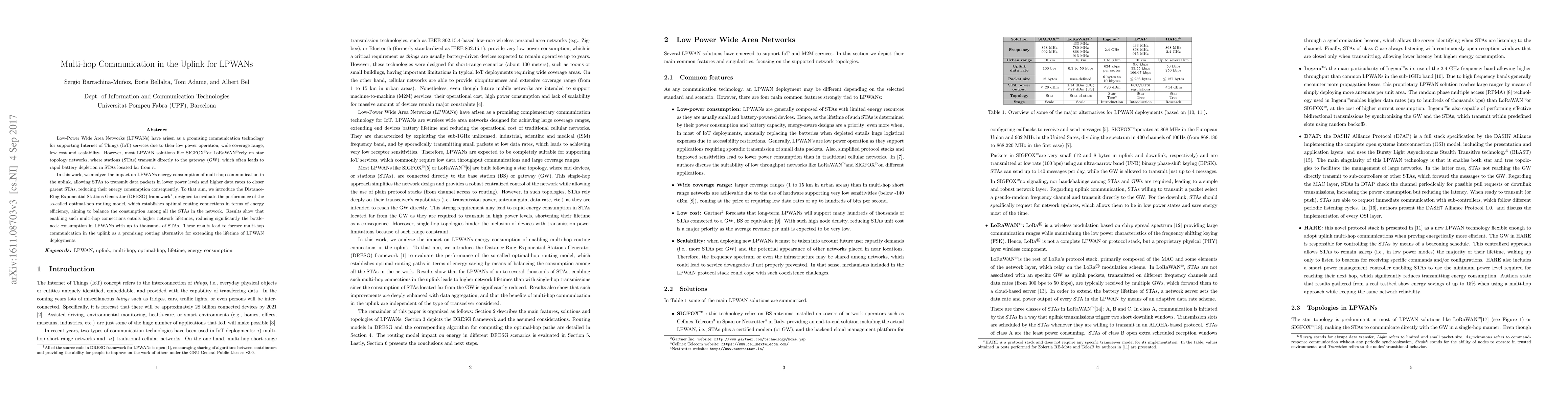 This paper investigates multi-hop communication in the uplink for Low-Power Wide Area Networks (LPWANs) to enhance energy efficiency and extend network lifetime. The proposed Distance-Ring Exponential Stations Generator (DRESG) framework evaluates optimal-hop routing, demonstrating significant reductions in energy consumption and bottlenecks, thus promising longer network lifespans.