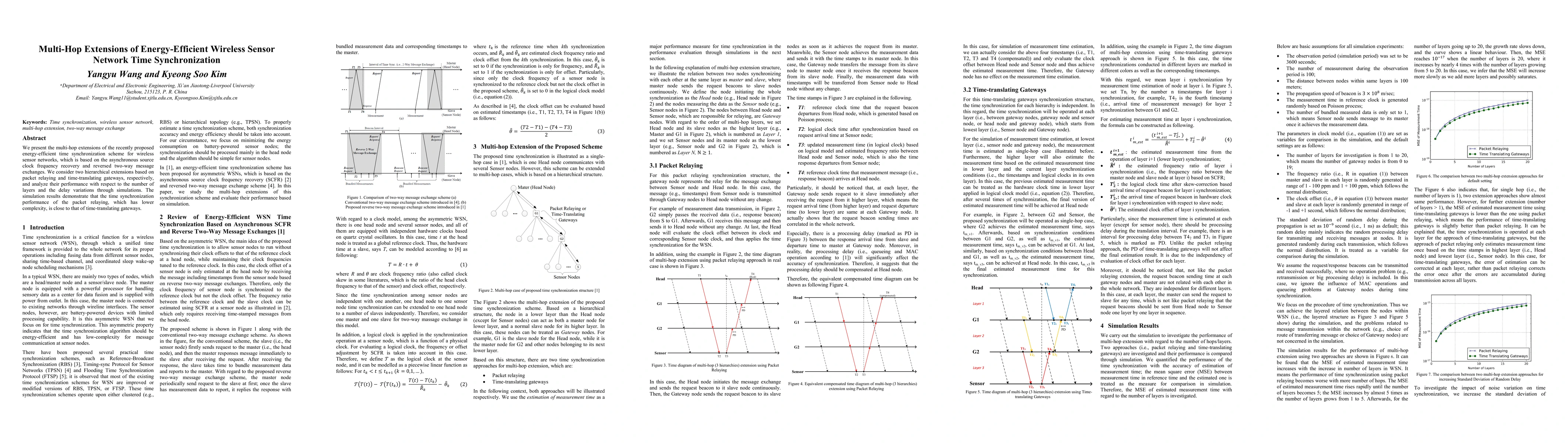 This paper extends an energy-efficient time synchronization scheme for wireless sensor networks with multi-hop solutions, analyzing performance through simulations. Packet relaying shows synchronization performance nearly equivalent to time-translating gateways, with lower complexity.