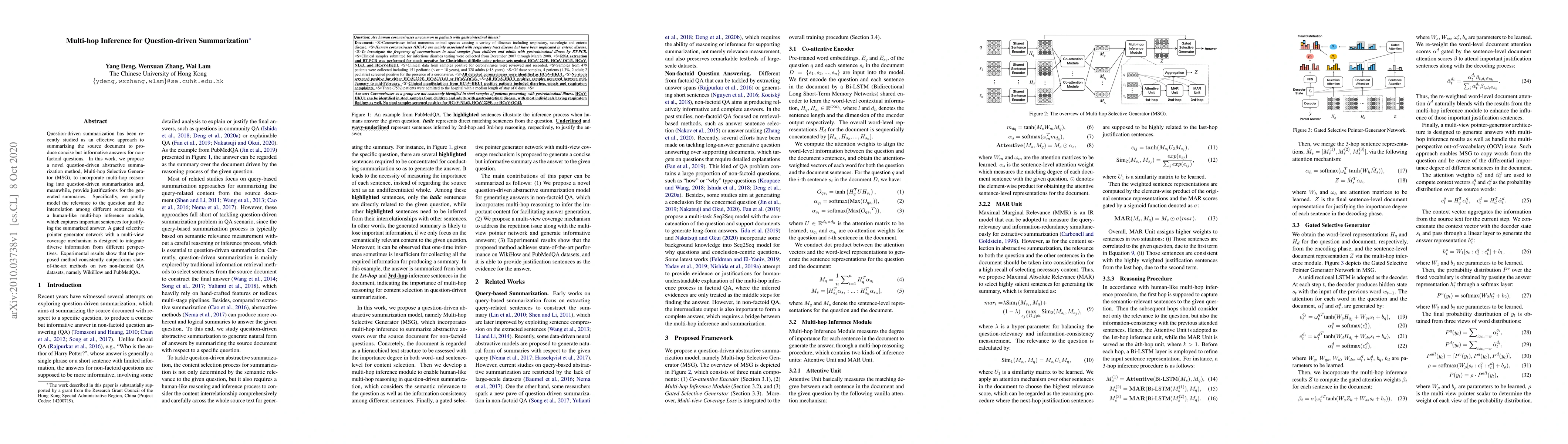 A new method called Multi-hop Selective Generator (MSG) improves question-driven summarization by incorporating multi-hop reasoning and provides justifications for the generated summaries, outperforming state-of-the-art methods on two non-factoid QA datasets.