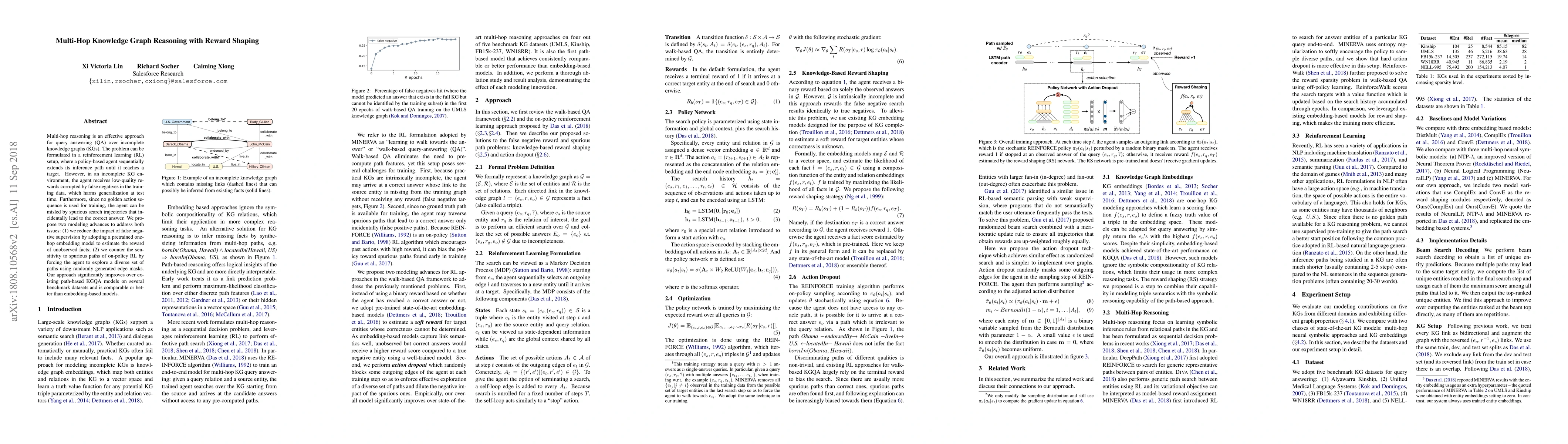 This research paper proposes two modeling advances to improve multi-hop knowledge graph reasoning in incomplete knowledge graphs, addressing issues with false negative rewards and spurious search trajectories. The approach shows significant improvement over existing models on benchmark datasets.
