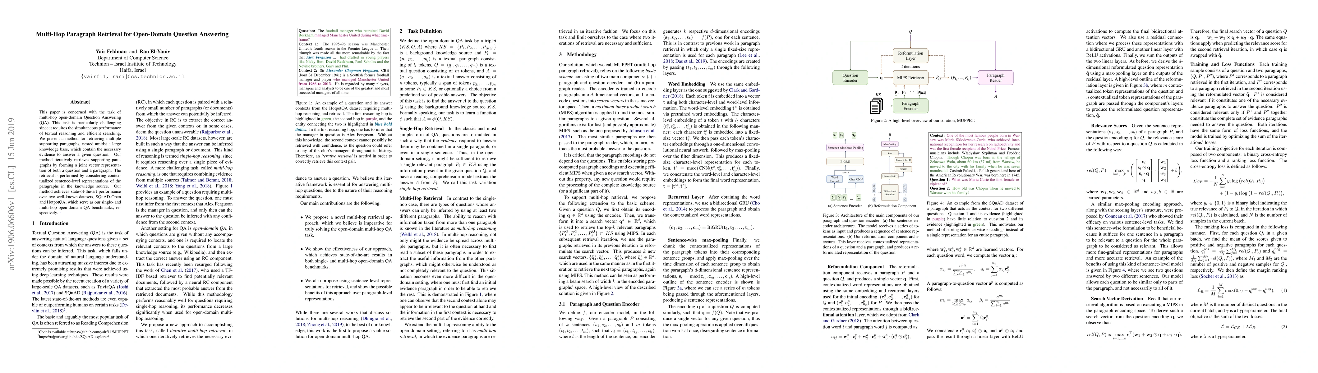 This paper proposes a method for multi-hop open-domain question answering by iteratively retrieving multiple supporting paragraphs from a large knowledge base using joint vector representations and contextualized sentence-level embeddings. The approach achieves top performance on SQuAD-Open and HotpotQA datasets.