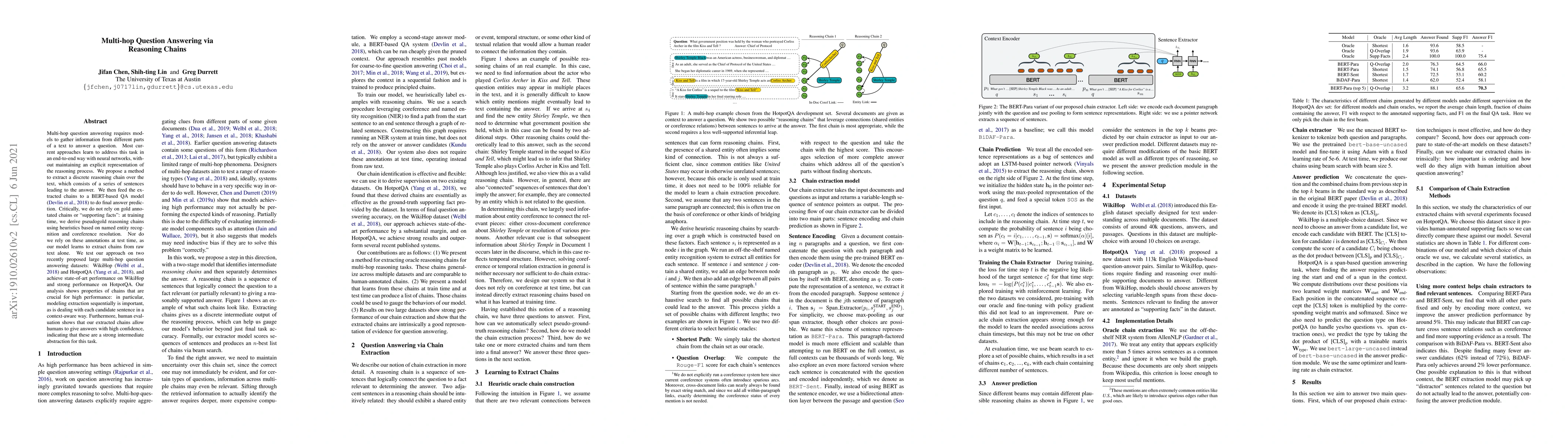 This paper proposes a method for multi-hop question answering that extracts discrete reasoning chains from text, feeding them into a BERT-based model for final answer prediction. The approach leverages heuristics for pseudogold chain generation during training, achieving state-of-the-art results on WikiHop and strong performance on HotpotQA.
